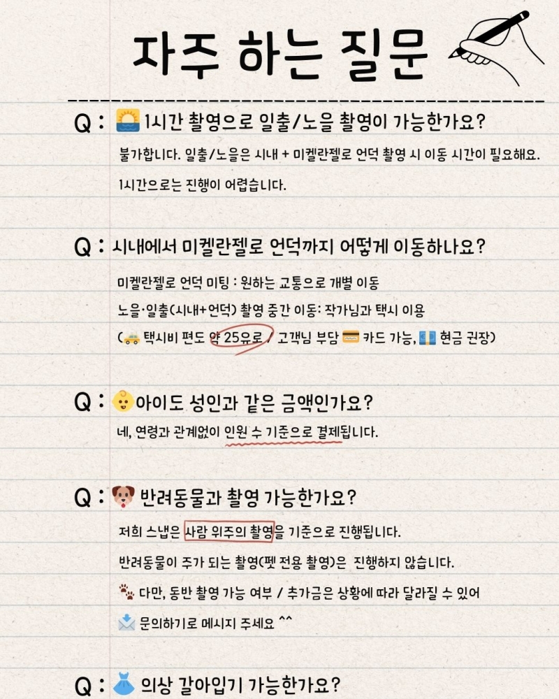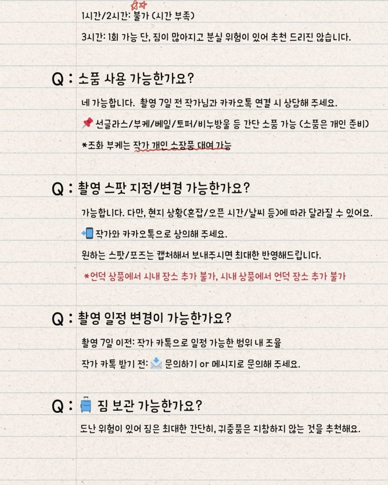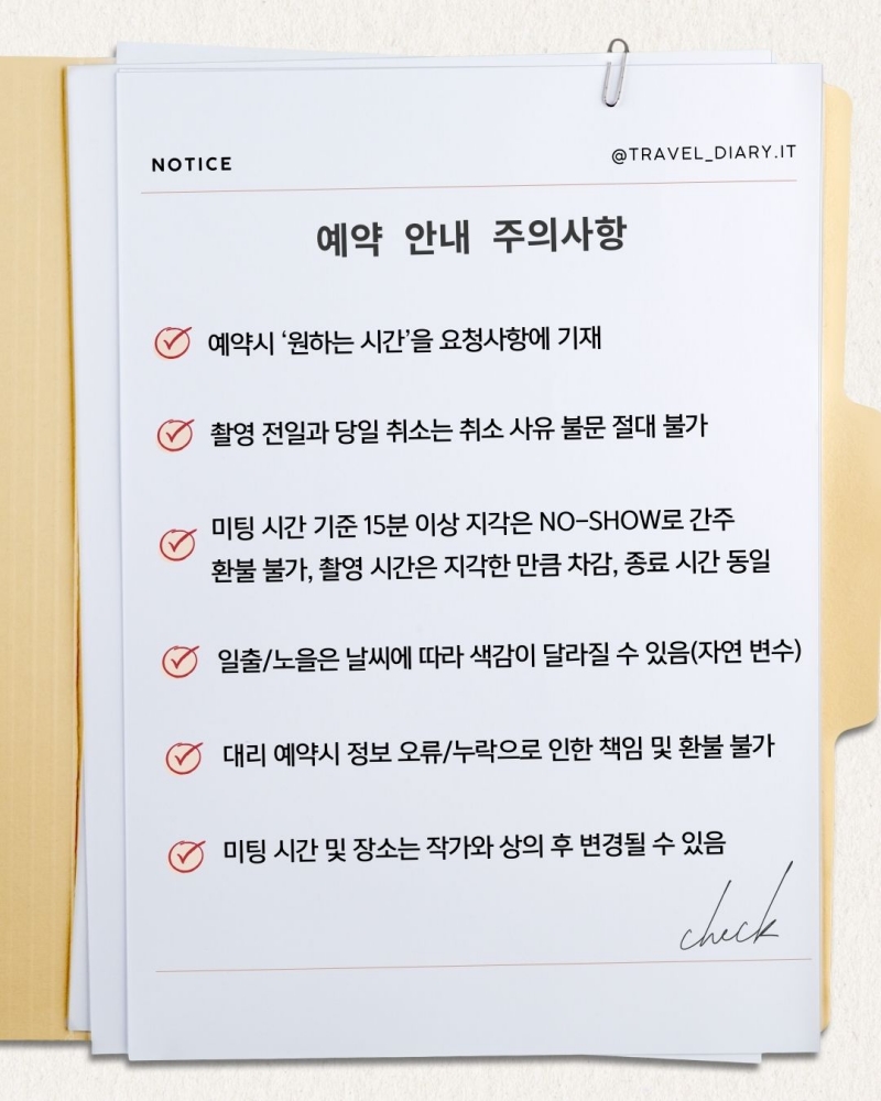 예약 후 대략적인 시간을 카카오톡 메세지로 확정 후, 촬영 7일 전 정확한 시간 카카오톡으로 안내드립니다.