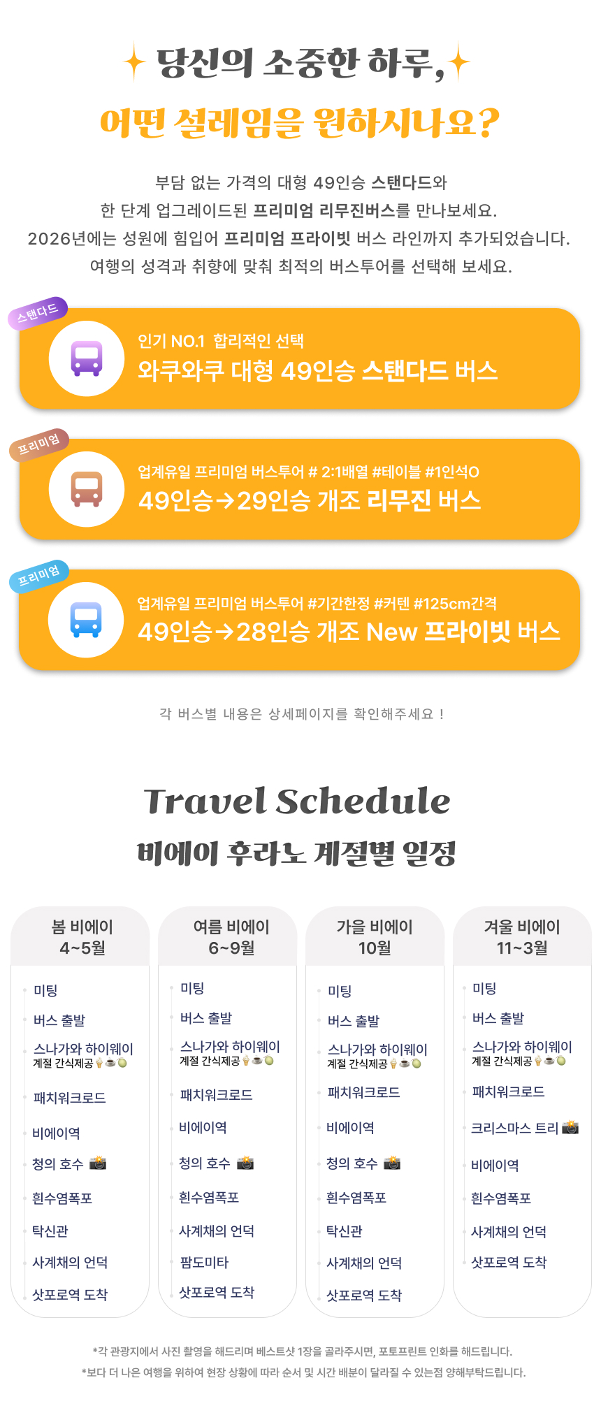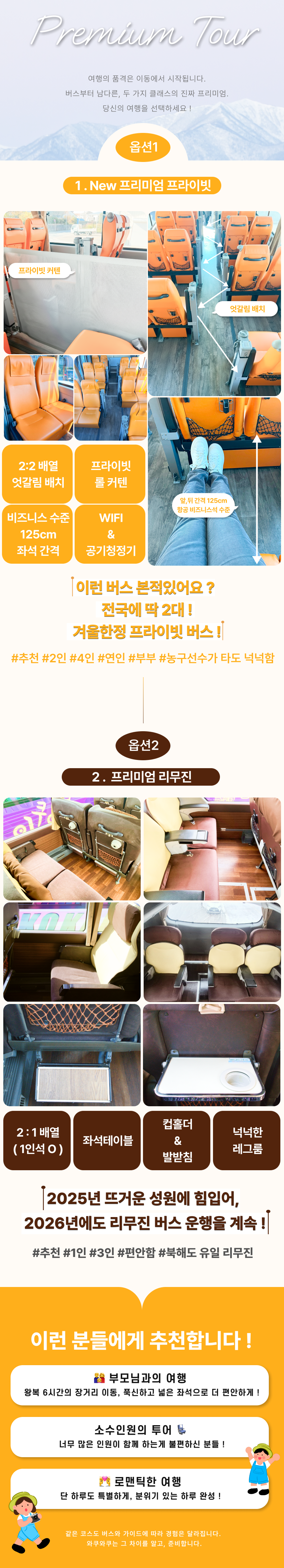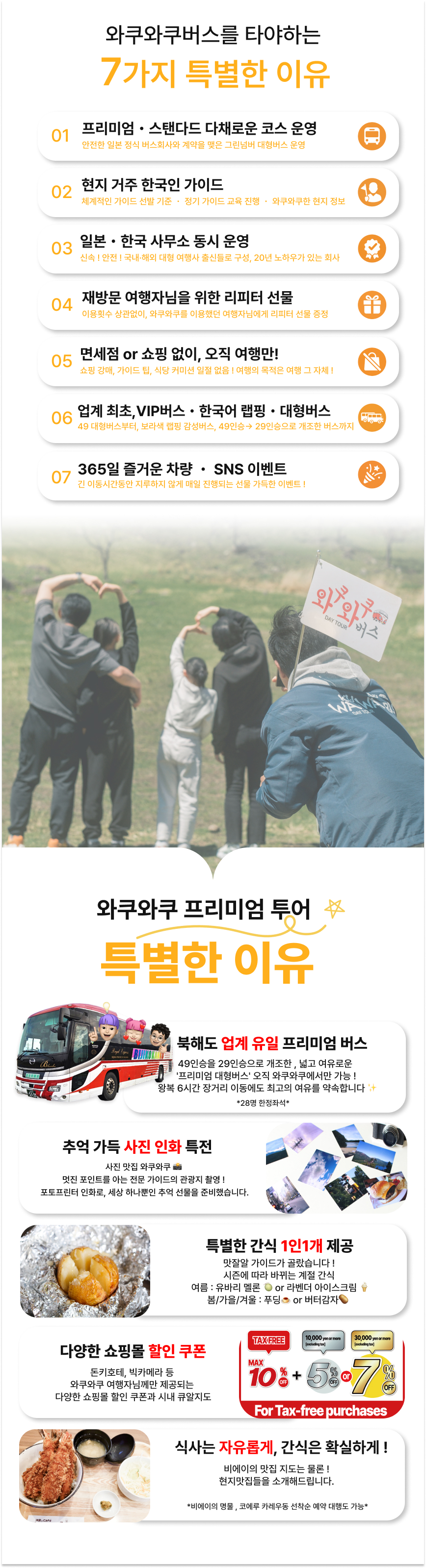 한국어 제공🚌 북해도 최초, 프리미엄 버스! 북해도 최초, 두 가지 클래스!!🚌 🚌 크기는 그대로, 좌석은 넓게! 28인승 버스로 편안한 투어를 즐겨보세요 🚌 ❤️ 와쿠와쿠 프리미엄 투어에서만 드리는 혜택 ❤️ ✨ 북해도 업계 유일, 두 가지 VIP 리무진 대형 버스로 즐기는 투어 프리미엄 프라이빗 버스 | 프라이빗 커텐 설치의 29인승 대형 프라이빗 버스💛 프리미엄 리무진 버스 | 2:1 배치로, 쾌적한 넓이의 29인승 대형 리무진 버스🤎 ✨ 추억 가득, 사진 인화 특전 제공 ✨ 맛잘알 가이드가 고른 북해도 계절 간식 1인 1개 제공 ✨ 특별 제작한 QR 맛집 지도 제공 및 돈키호테 할인 쿠폰 제공