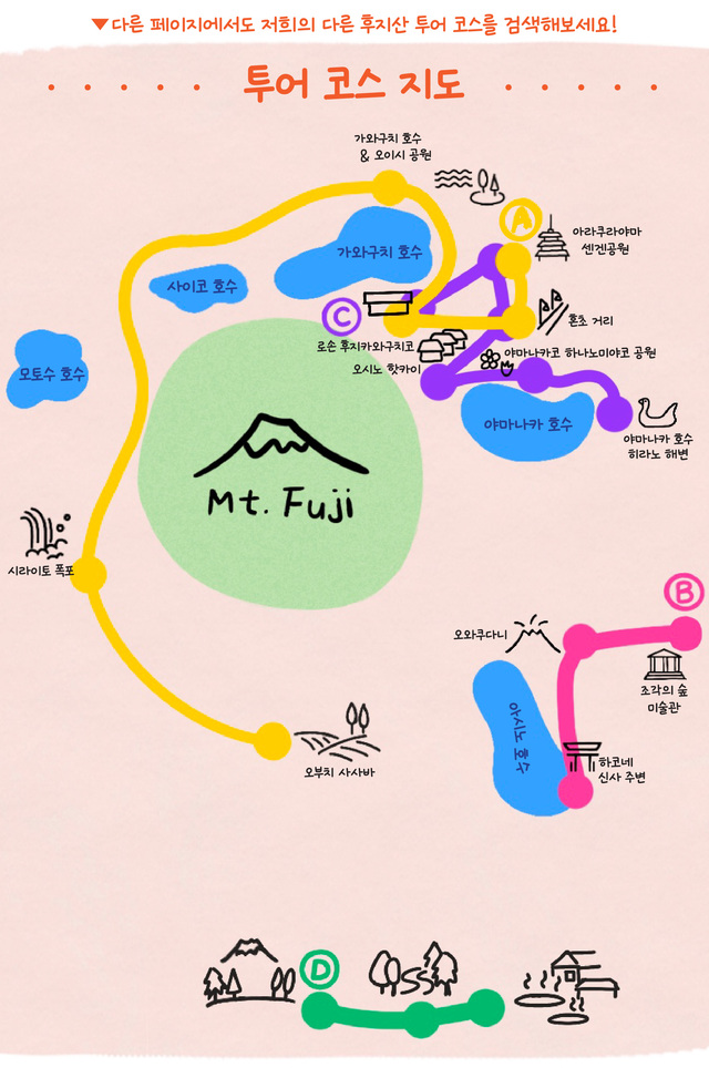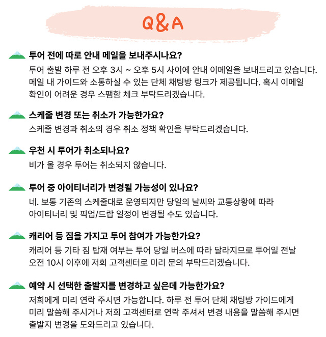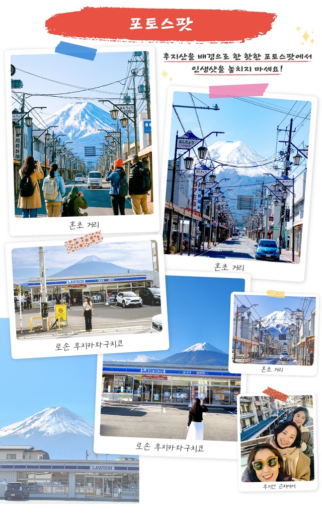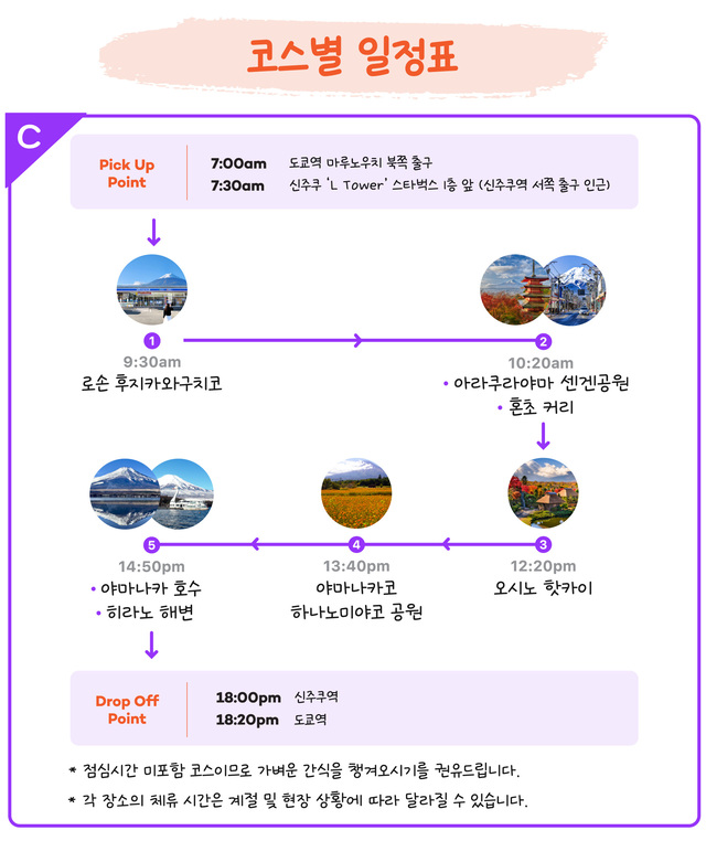 🙌 도쿄에서 후지산 보러 가기 어렵지 않아요. 케이투어스토리의 버스투어로 편하게 후지산을 만나보세요! 🔥소인 단독 구매는 불가합니다. 📢 알림: 2025년 11월 1일부터 30일까지 본 투어는 특별 단풍 시즌 일정으로 진행됩니다. 이에 따라 '야마나카 호수 히라노노하마' 대신 '가와구치 호수 단풍 회랑'을 방문하며, 전체적인 투어 순서도 조정됩니다. 11월 특별 단풍 시즌 Itinerary : 07:00am 도쿄역 마루노우치 북쪽 출구 출발 07:30am 신주쿠역 'L Tower'의 스타벅스 1층 앞 (신주쿠역 서쪽 출구 인근) 출 09:30 - 10:30am 가와구치호 단풍 회랑 10:45 - 11:00am 로손 후지카와구치코 11:20 - 12:50pm 아라쿠라야마 센겐공원 / 혼초거리 13:10 - 14:10pm 오시노 핫카이 14:30 - 15:30pm 야마나카코 하나노미야코 공원 15:40pm 하차지로 복귀 18:00pm 신주쿠역 도착 18:20pm 도쿄역 도착