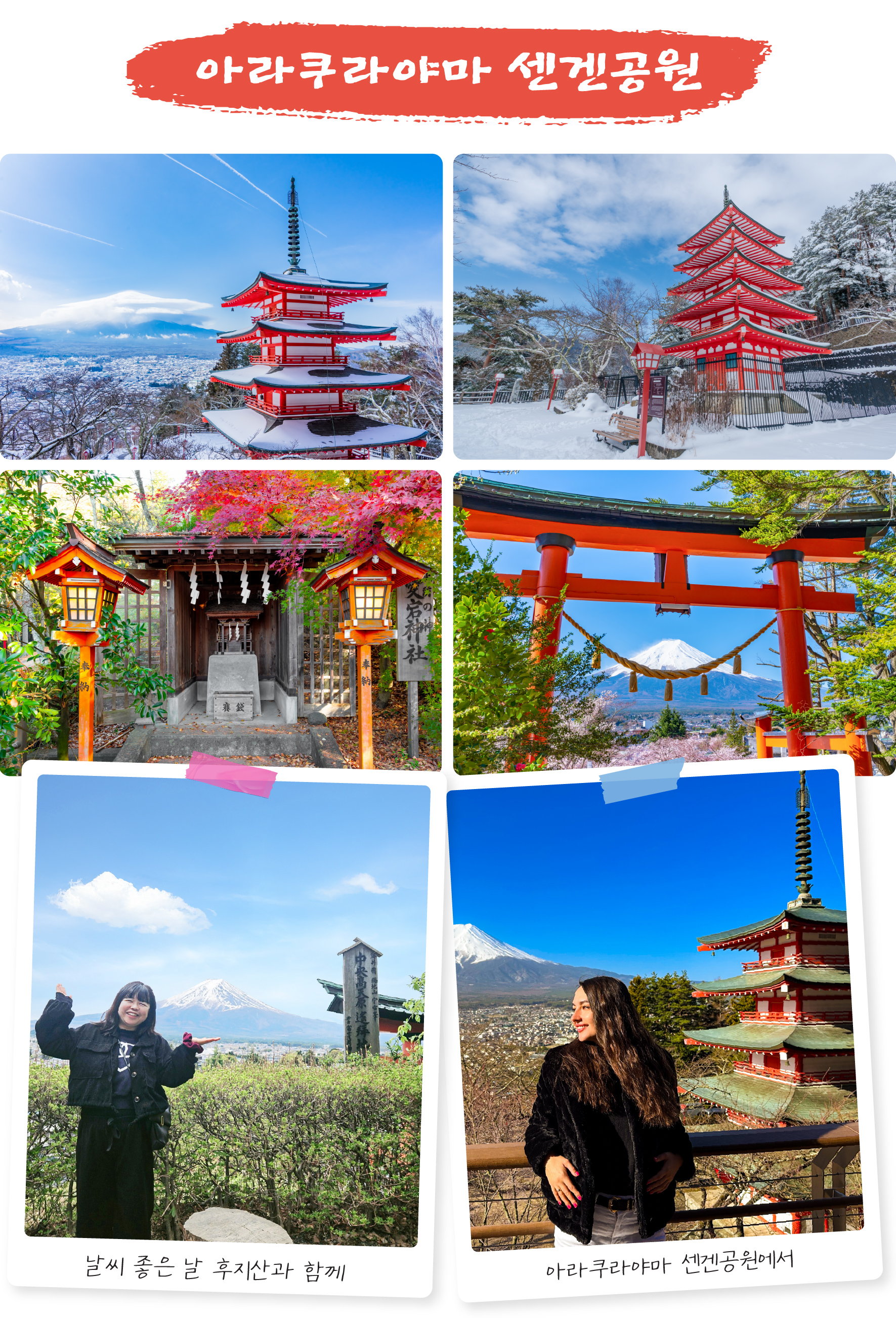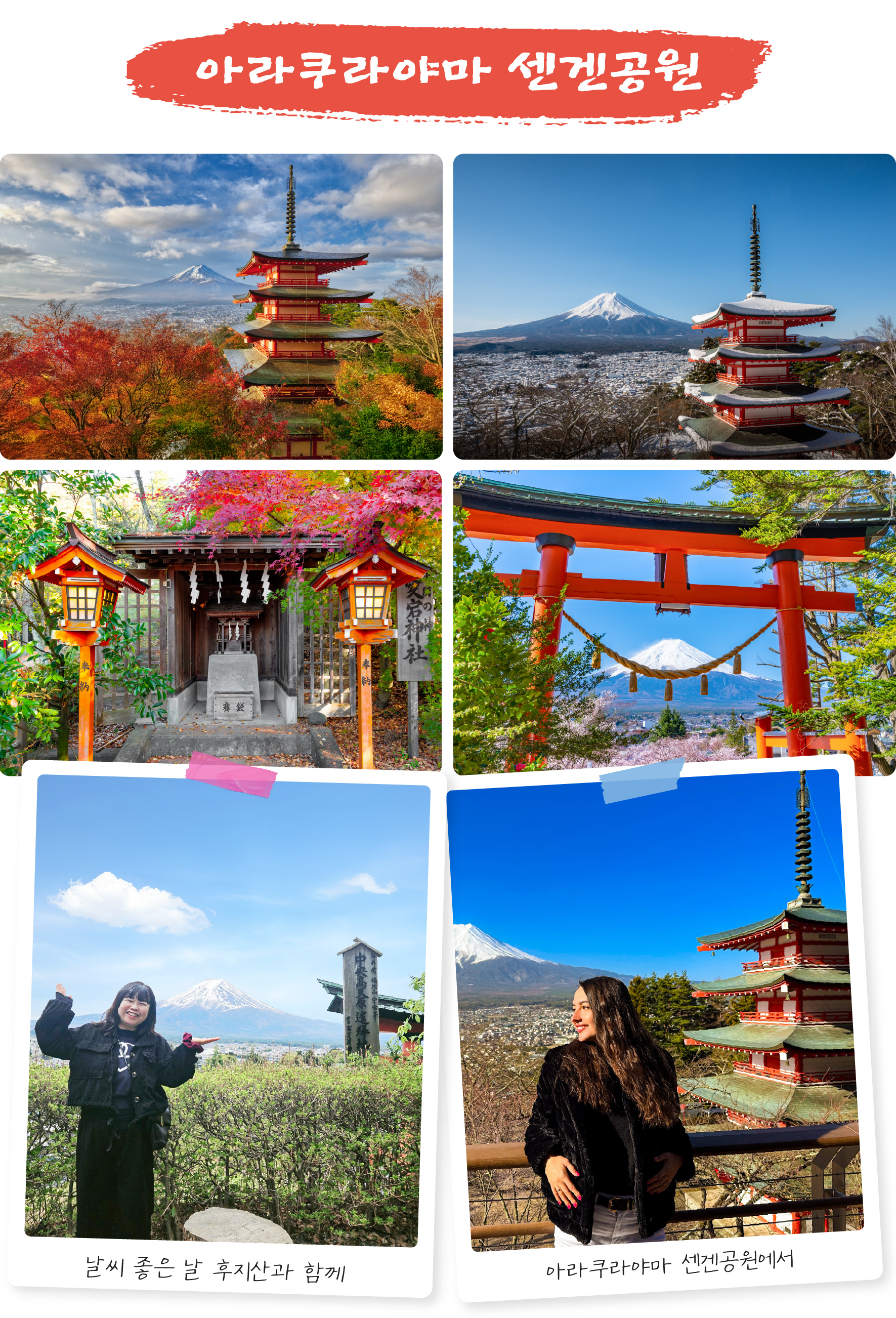도심을 벗어나 후지산 주변 자연을 만끽하는 일일 투어를 소개해요. 아라쿠라야마 센겐공원에서 오중탑과 후지산 절경을 감상하고, 전통적인 분위기의 오시노핫카이 마을에서 산책도 즐겨 보세요. 이어지는 야마나카코 하나노미야코 공원에서는 계절마다 펼쳐지는 꽃밭을 즐겼다면 투어의 마지막은 야마나카호수에서 여유롭게 마무리해보세요. 아름다운 호숫가를 산책하거나 백조보트(선택사항)를 타볼 수도 있어요.