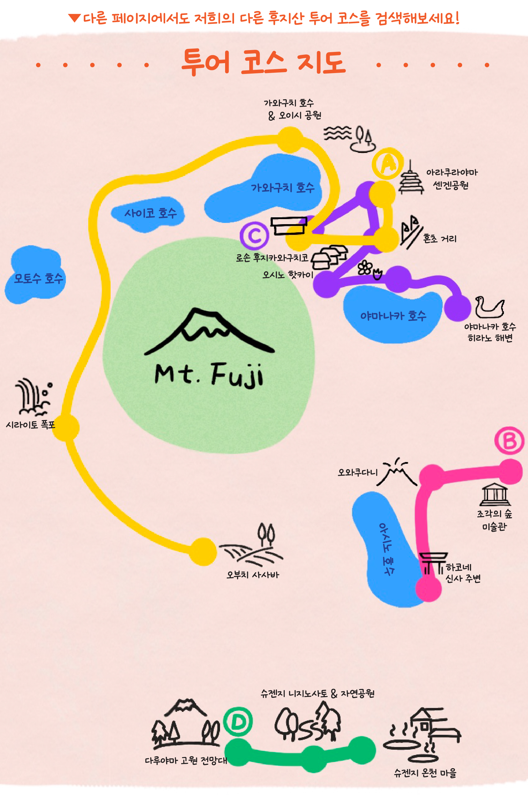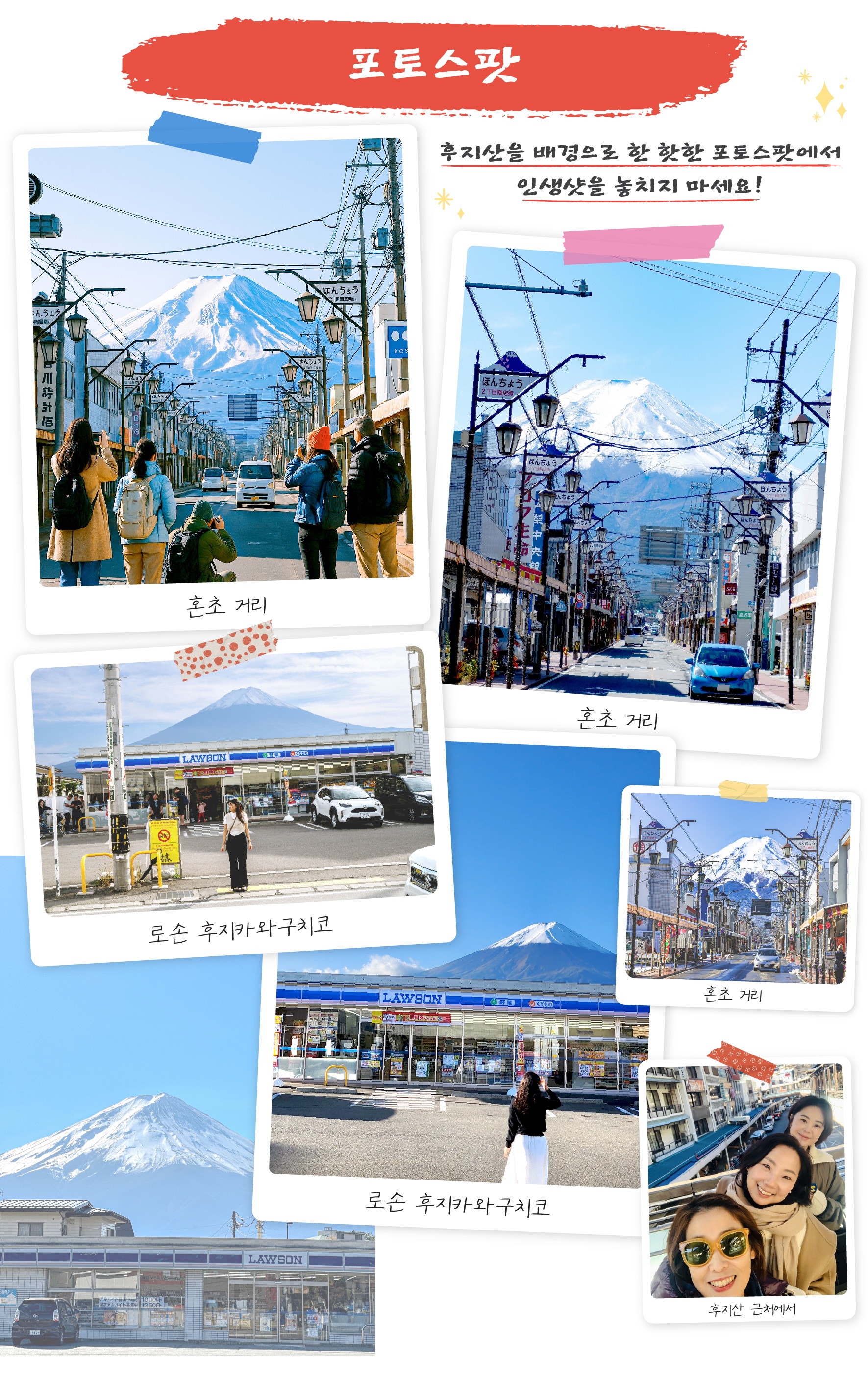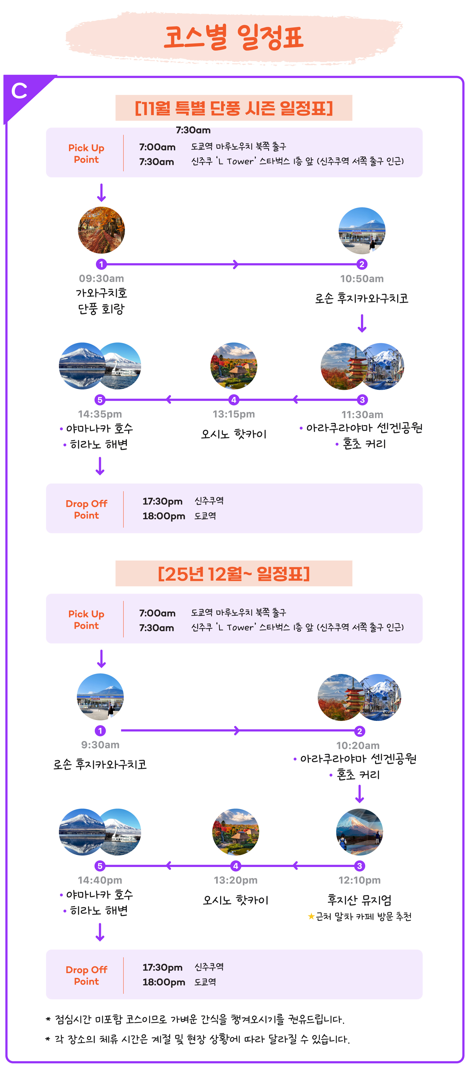 한국어 제공,영어 제공,중국어 제공🙌 도쿄에서 후지산 보러 가기 어렵지 않아요. 케이투어스토리의 버스투어로 편하게 후지산을 만나보세요! 🔥소인 단독 구매는 불가합니다. 📢 알림: 2025년 11월 1일부터 30일까지 본 투어는 특별 단풍 시즌 일정으로 진행됩니다. 이에 따라 '야마나카 호수 & 히라노 해변' 대신 '가와구치 호수 단풍 회랑'을 방문하며, 전체적인 투어 순서도 조정됩니다. [특별 단풍 시즌 일정] 07:00am 도쿄역 마루노우치 북쪽 출구 출발 07:30am 신주쿠역 'L Tower'의 스타벅스 1층 앞 (신주쿠역 서쪽 출구 인근) 출발 09:30 - 10:30am 가와구치호 단풍 회랑 10:50 - 11:10am 로손 후지카와구치코 11:30 - 13:00pm 아라쿠라야마 센겐공원 / 혼초거리 13:15 - 14:15pm 오시노 핫카이 14:35 - 15:20pm 야마나카 호수 & 히라노 해변 15:30pm 하차지로 복귀 17:30pm 신주쿠역 도착 18:00pm 도쿄역 도착