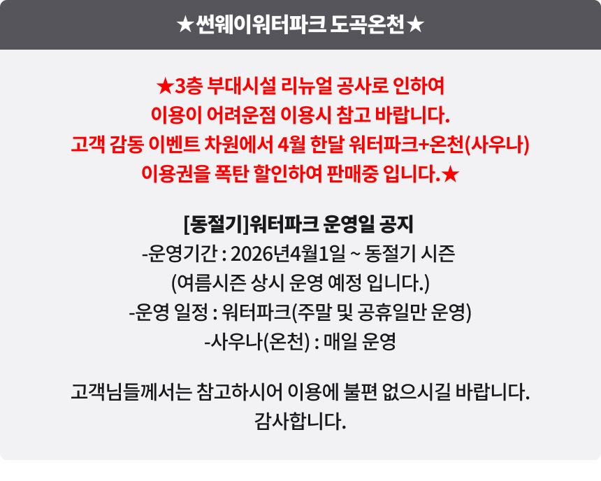 사계절 내내 즐기는 온천 워터플레이, 전남 썬웨이 워터파크 도곡온천 특가 입장권으로 특별한 하루를 만나보세요. ♨️💦