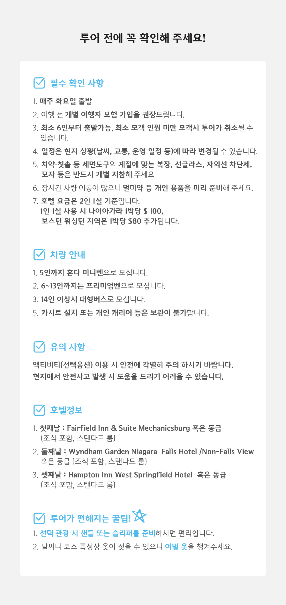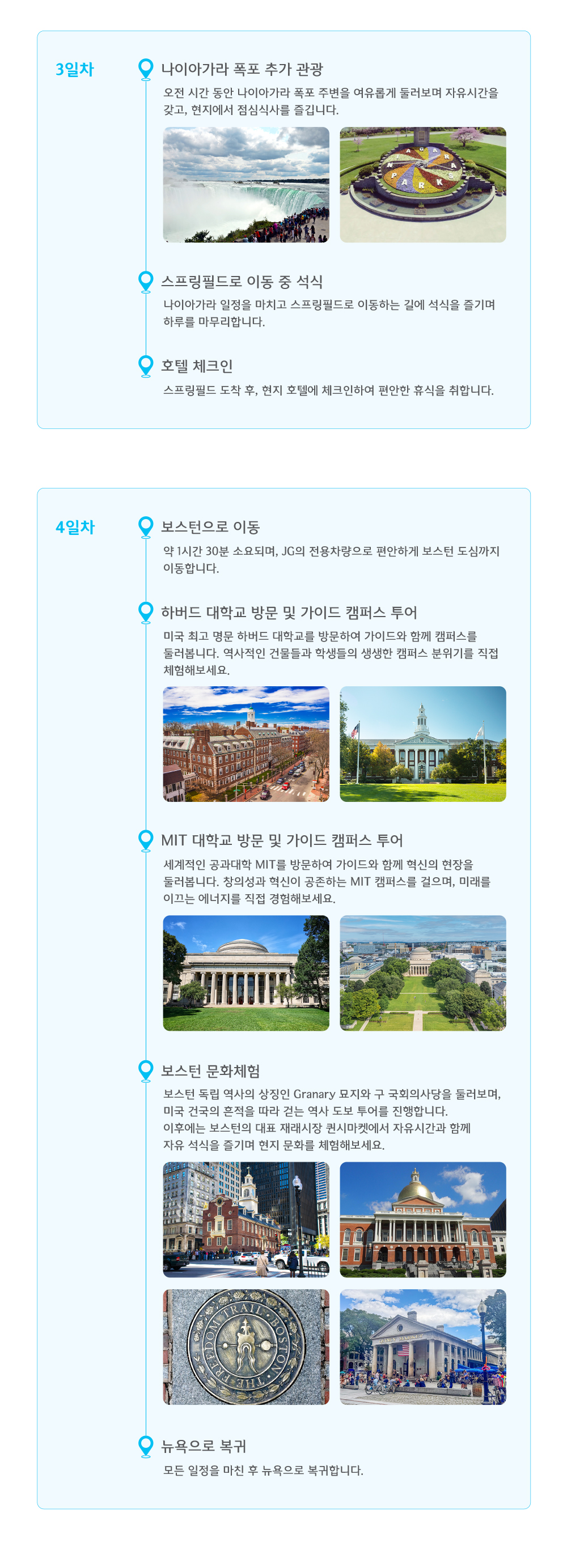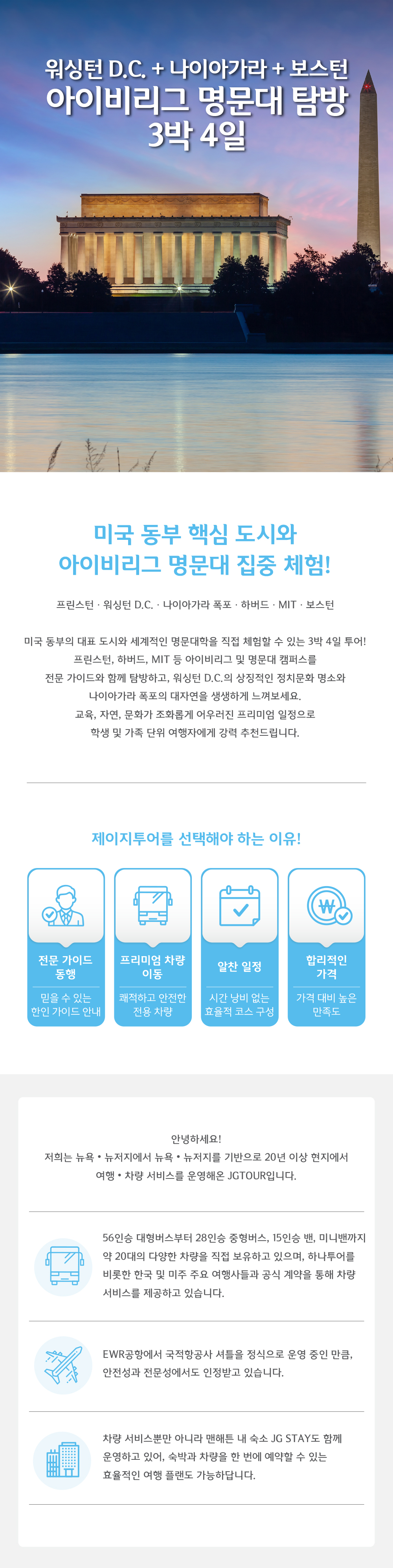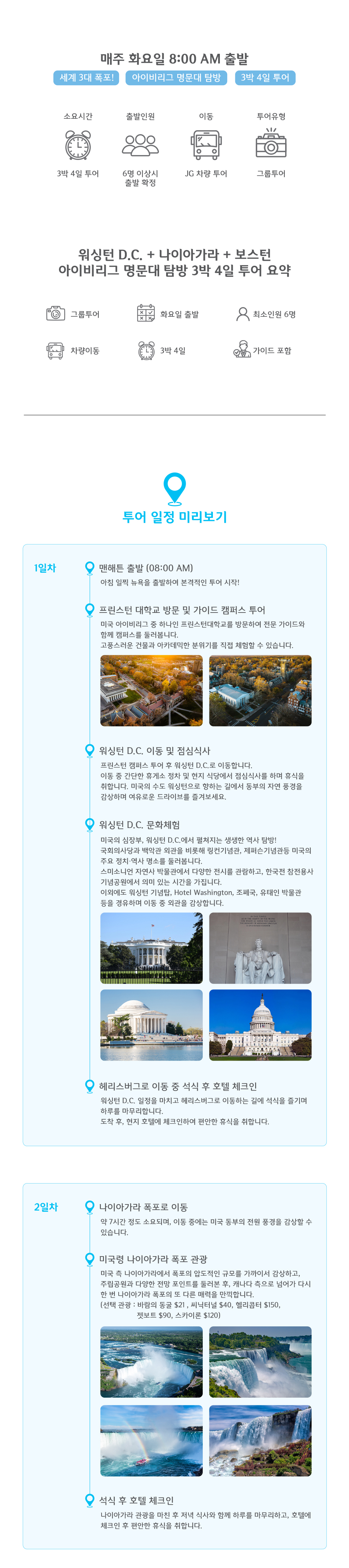 뉴욕에서 출발해 워싱턴의 문화를 체험하고 나이아가라 폭포 근처 호텔에 머물면서 대자연을 오랫동안 감상할 수 있어요. 또 아이비리그 명문대인 하버드와 MIT 공대를 방문해서 미국 동부의 역사적인 건물들과 생생한 캠퍼스 분위기를 직접 체험할 수 있어요. 걷는 것에 지치고 길을 몰라서 헤매지 말고, 투어 중 모든 일정 동안 편안한 전용 차량으로 이동하여 여행의 피로를 덜어 보세요. 또한 여행 기간 동안의 숙박과 마지막 날 저녁을 제외한 모든 식사가 포함되어 있기 때문에 편리하게 이용 가능해요.