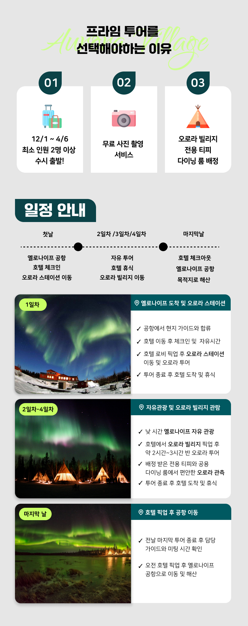 캐나다 옐로나이프의 대표적인 오로라 관측 명소 두 곳, '오로라 스테이션'과 '오로라 빌리지'를 한 번의 여행으로 모두 경험하는 특별한 상품이에요. 각각 다른 매력을 지닌 장소에서 3일 밤 동안 오로라를 만나요. 편안한 전망대를 갖춘 오로라 스테이션에서의 하루, 그리고 원주민의 티피(Teepee)가 있어 독특한 감성을 느낄 수 있는 오로라 빌리지에서 이틀 밤을 보내며 잊지 못할 오로라의 추억을 완성할 수 있어요. 단 2명만 모여도 출발이 가능하고 공항으로 픽업과 샌딩 서비스를 제공하기 때문에 편리하게 여행을 즐길 수 있어요.