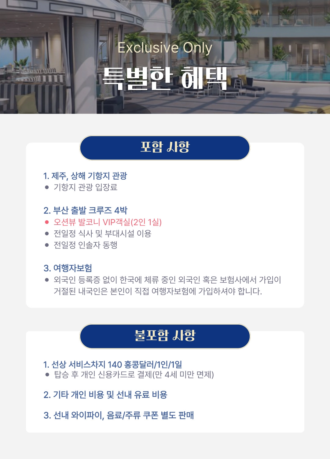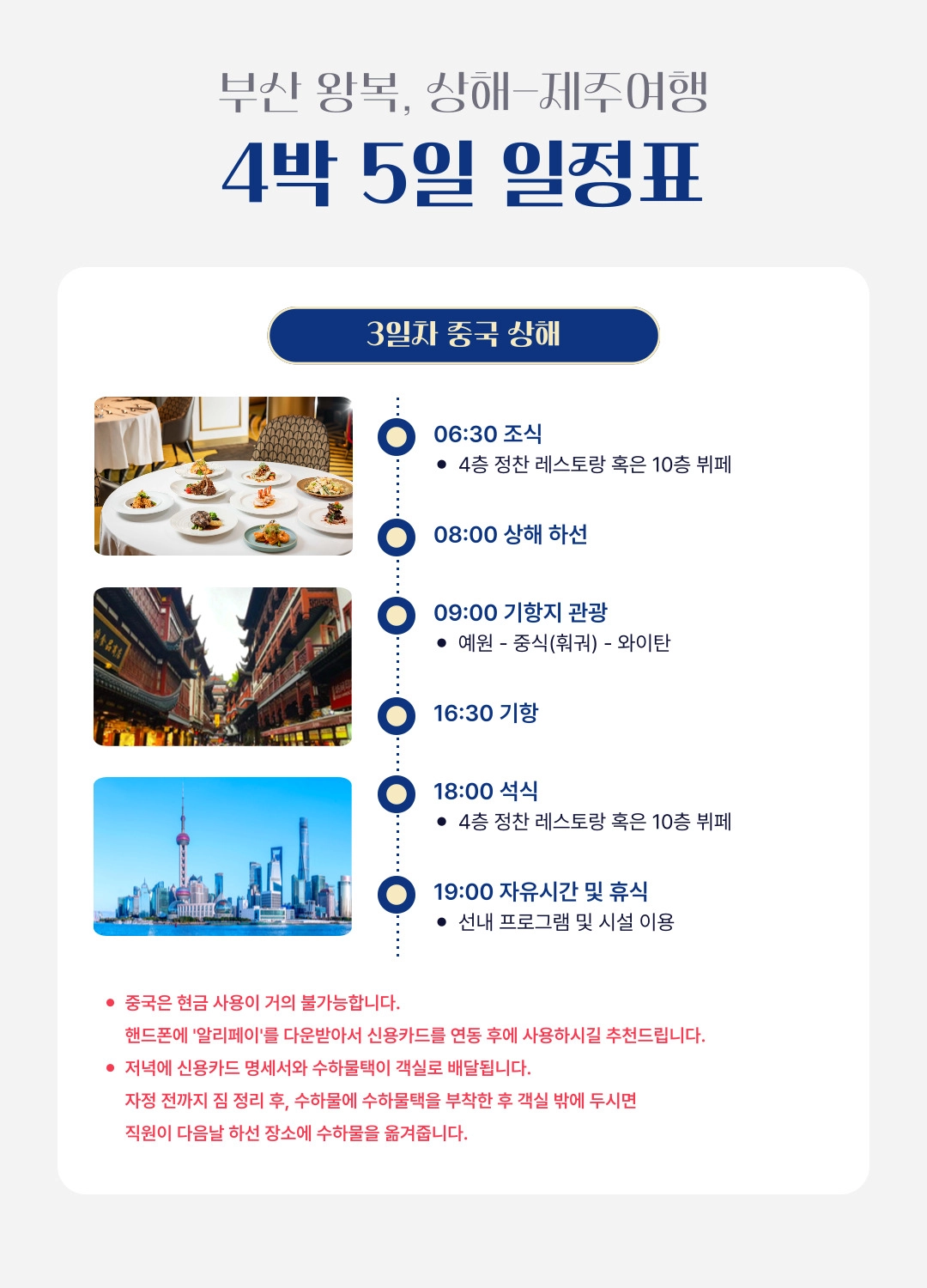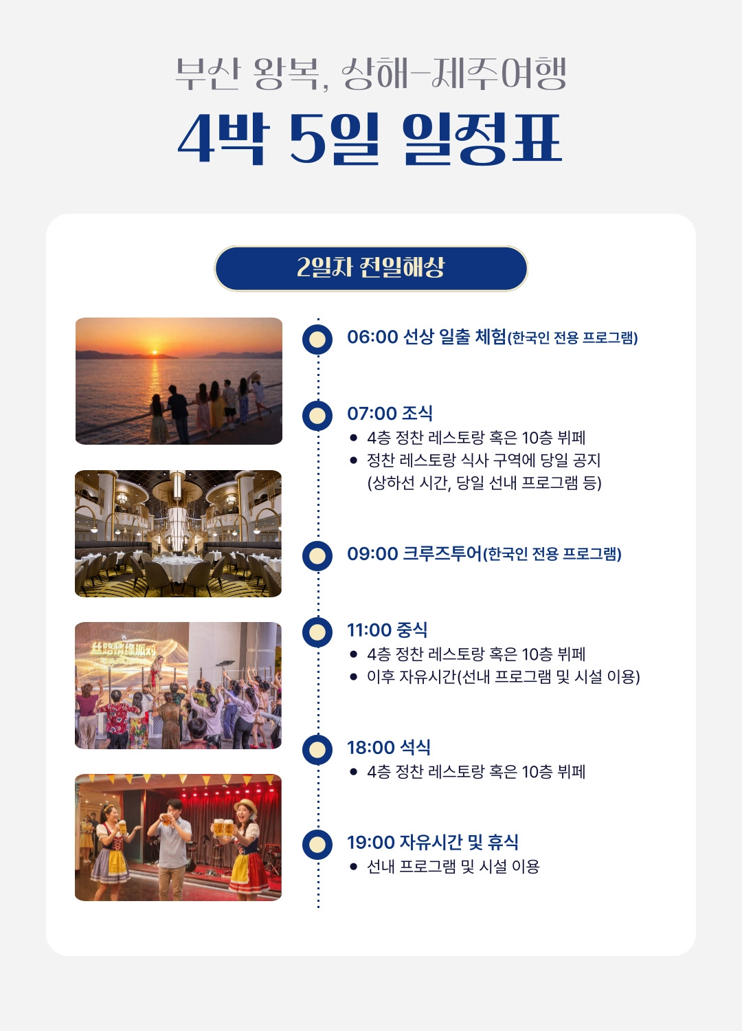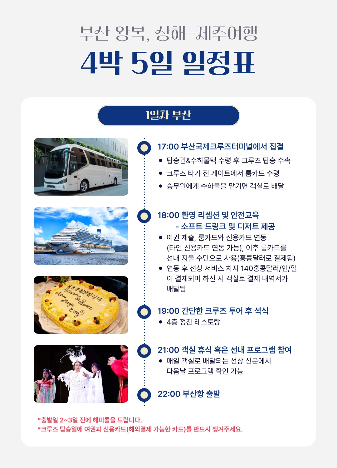 한국어 제공부산 출발, 상하이 & 제주 4박 5일 프리미엄 크루즈 여행 = 3 ✨조기 완납 시 1인당 최대 30만원 할인 혜택! ✨와그에서 준비한 5% 추가 할인 혜택까지! 지금 가장 좋은 타이밍, 바다 위 럭셔리 여행을 합리적인 가격으로 만나보세요 ~ ! - 10월 출발 항차 6월30일까지 1인당 30만원 할인 - 11월 출발 항차 7월31일까지 1인당 30만원 할인 - 12월 출발 항차 7월31일까지 1인당 30만원 할인 * 해당 혜택은 10월 항차 - 6월 30일까지 / 11~12 항차 7월 31일까지 완납하실 경우에 한해서 적용됩니다. * 할인 혜택은 2인 완납자를 기준으로 적용되며, 3번째 승객은 대상에서 제외됩니다.