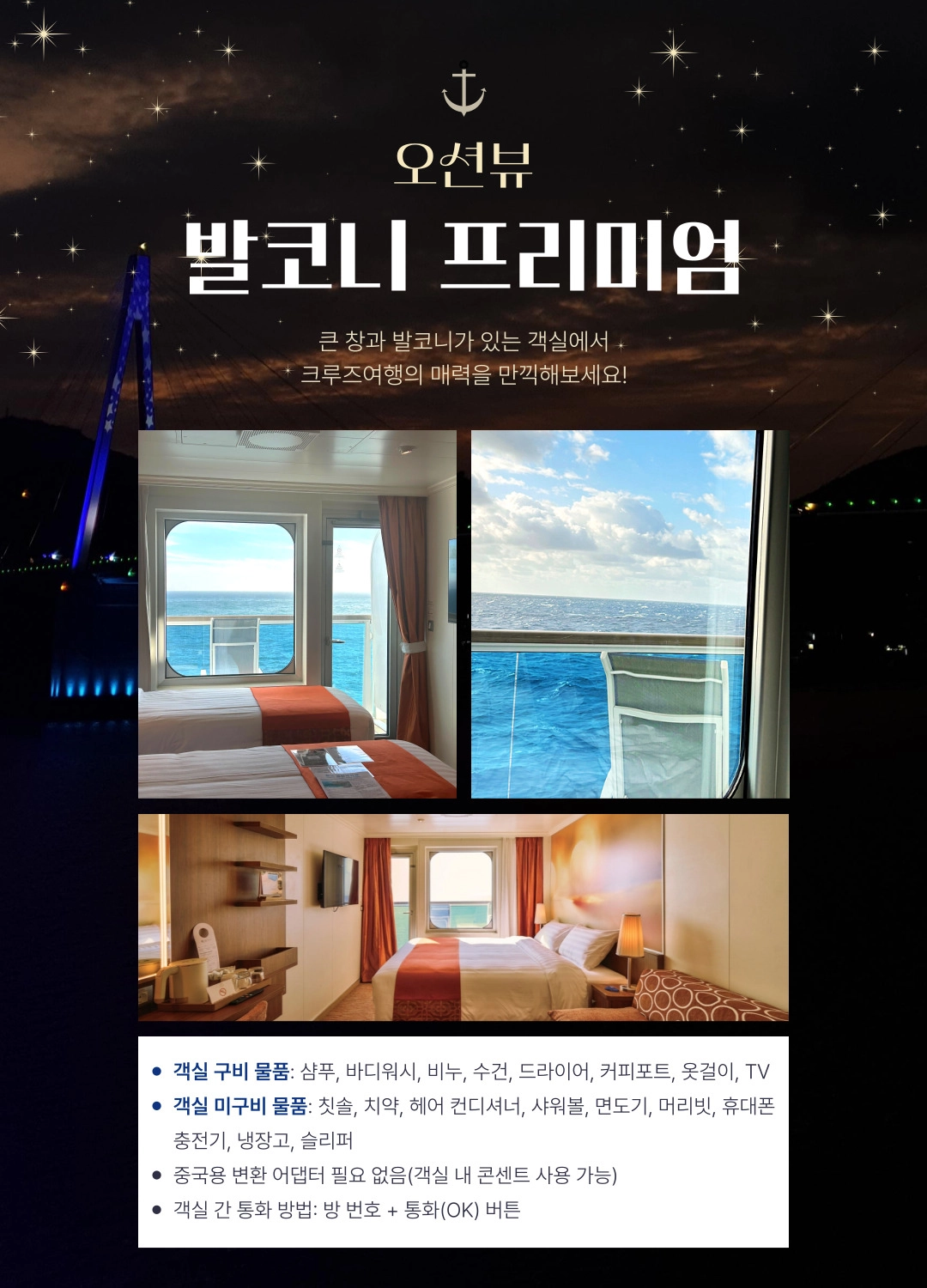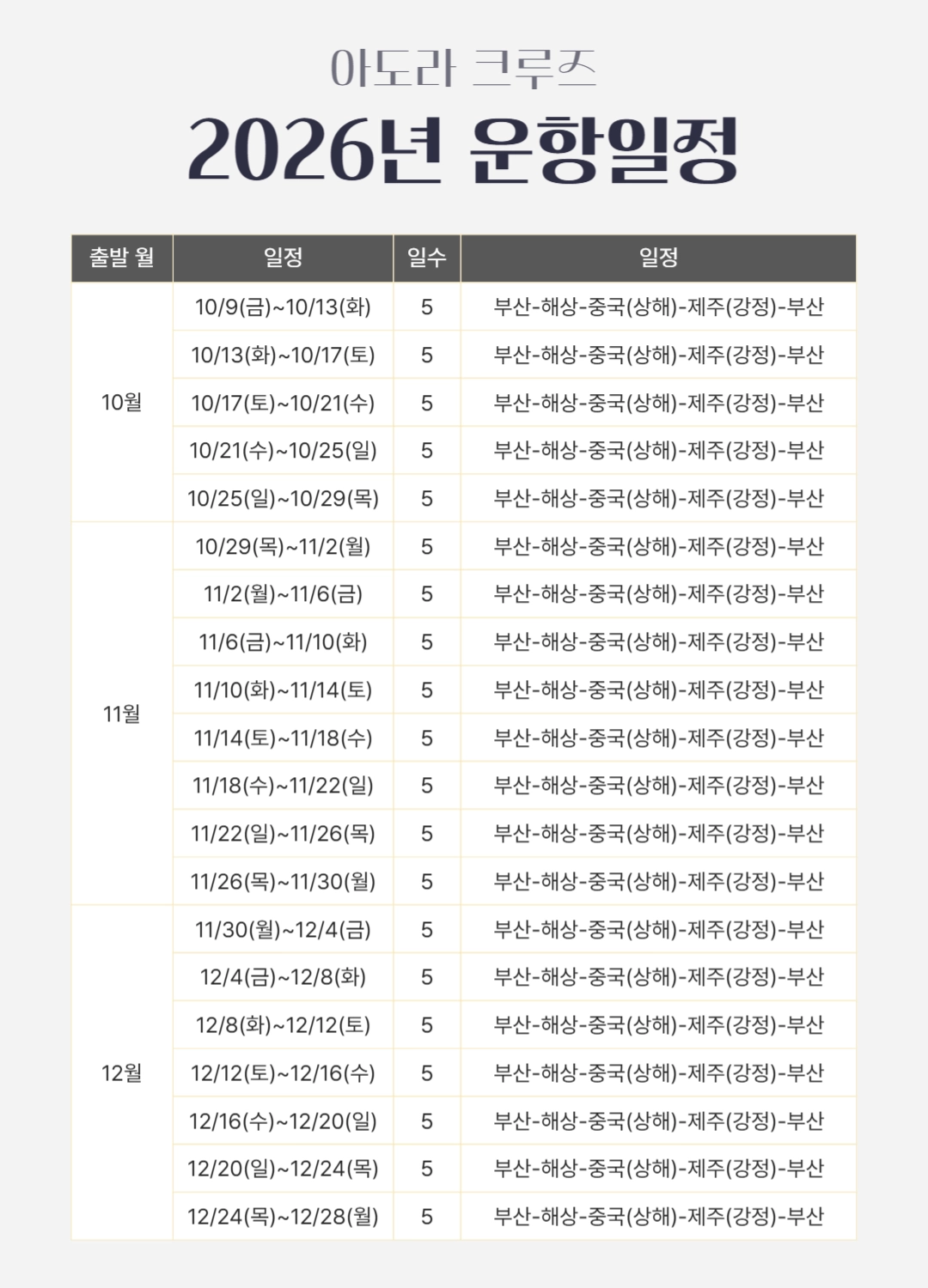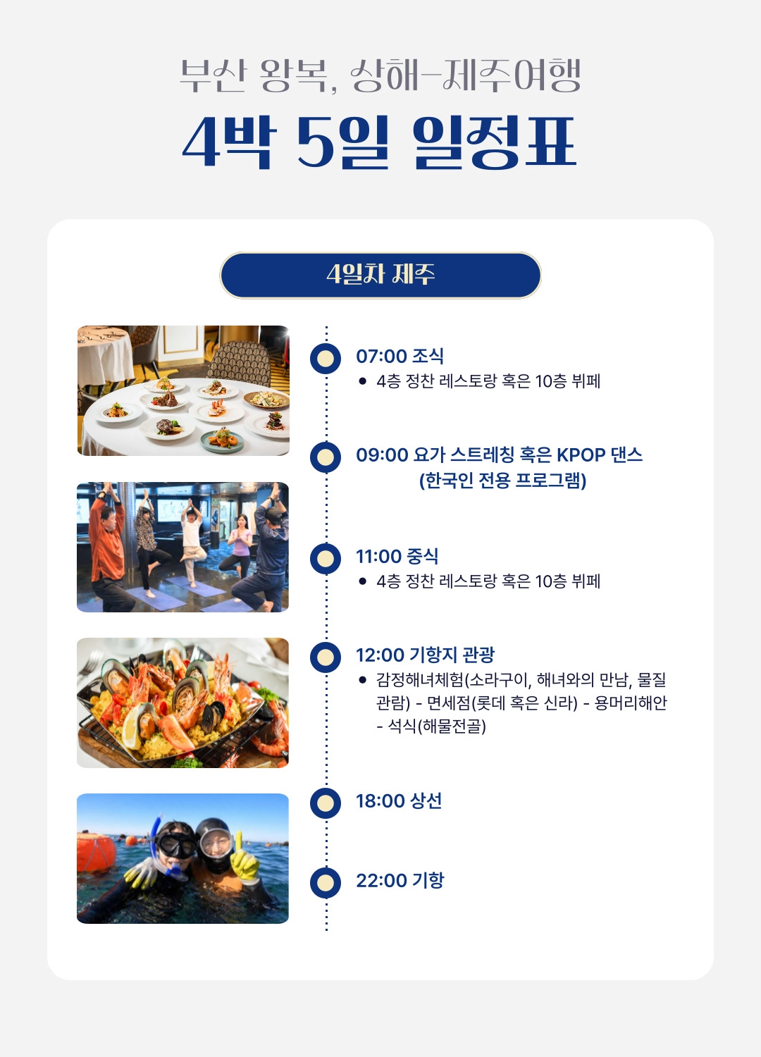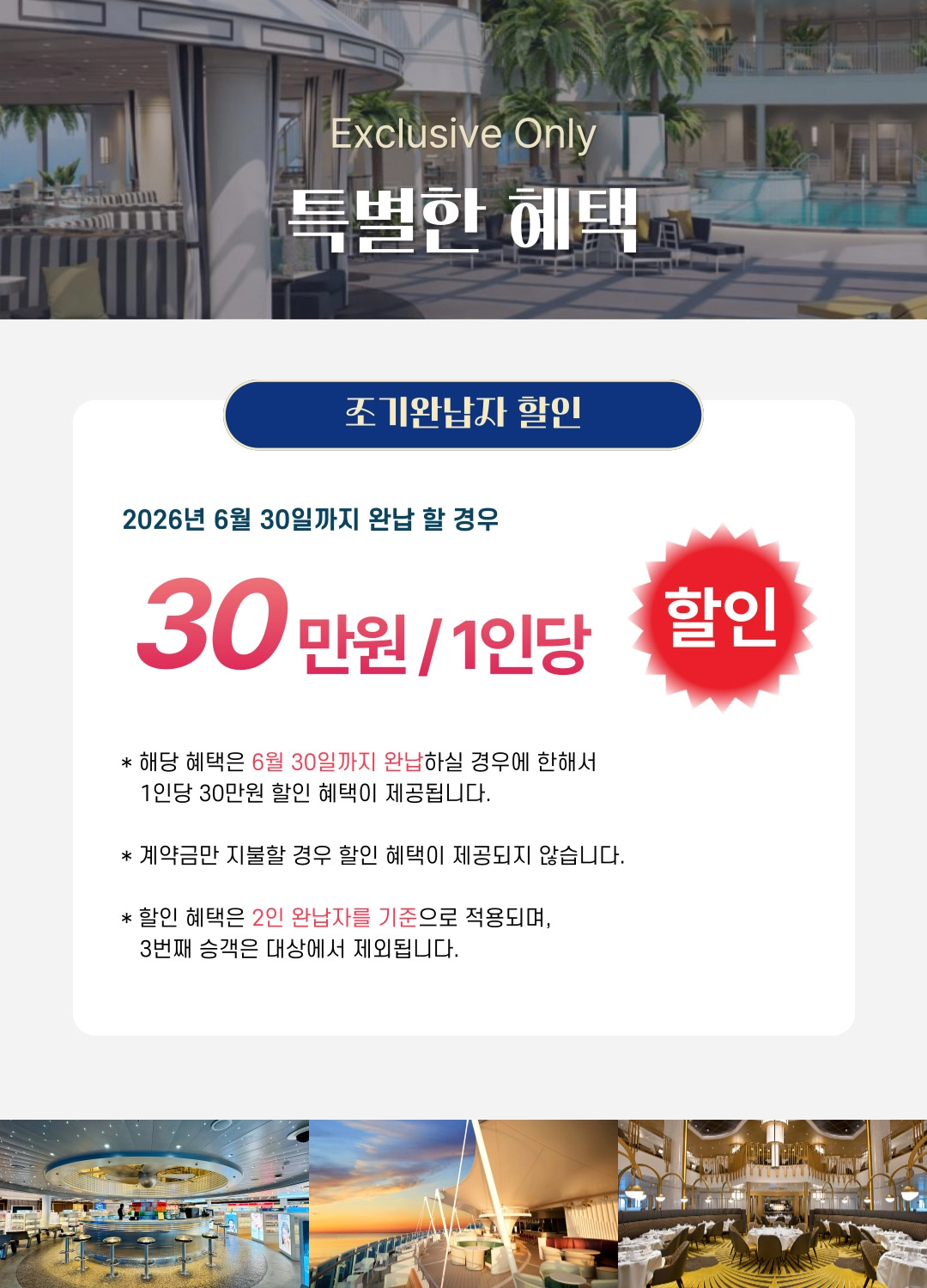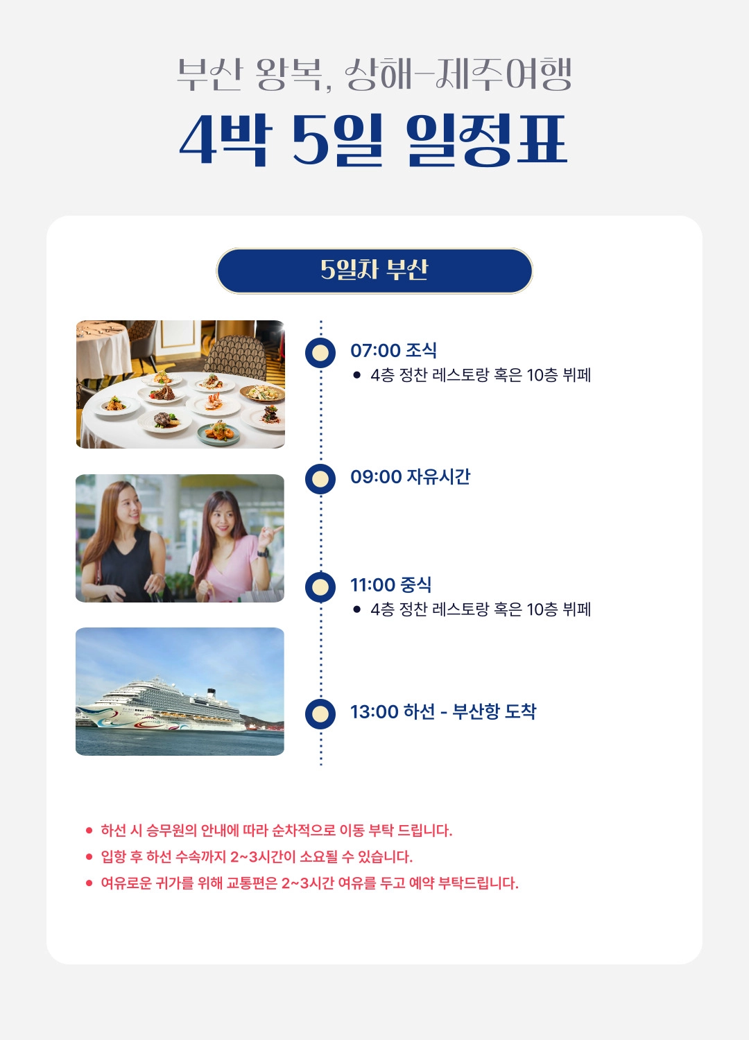 한국어 제공부산 출발, 상하이 & 제주 4박 5일 프리미엄 크루즈 여행 = 3 ✨조기 완납 시 1인당 최대 30만원 할인 혜택! ✨와그에서 준비한 5% 추가 할인 혜택까지! 지금 가장 좋은 타이밍, 바다 위 럭셔리 여행을 합리적인 가격으로 만나보세요 ~ ! - 10월 출발 항차 6월30일까지 1인당 30만원 할인 - 11월 출발 항차 7월31일까지 1인당 30만원 할인 - 12월 출발 항차 7월31일까지 1인당 30만원 할인 * 해당 혜택은 10월 항차 - 6월 30일까지 / 11~12 항차 7월 31일까지 완납하실 경우에 한해서 적용됩니다. * 할인 혜택은 2인 완납자를 기준으로 적용되며, 3번째 승객은 대상에서 제외됩니다.