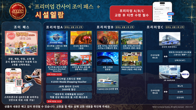 간사이 조이패스에 더 다양한 시설을 이용할 수 있는 프리미엄 간사이 조이패스를 소개해요. 기존 간사이 조이패스의 혜택에 더해, 프리미엄 A 시설 (유니버셜 스튜디오 재팬 입장권, 팝콘통 바우처, 식사 & 쇼핑 바우처 등) 중 2개과 프리미엄 B 시설 (교토 수족관 입장권, 캡틴 라인 왕복 승선권 등) 중 1개, 프리미엄C 의 간사이 리무진버스 편도 티켓까지 이용하실 수 있어요.