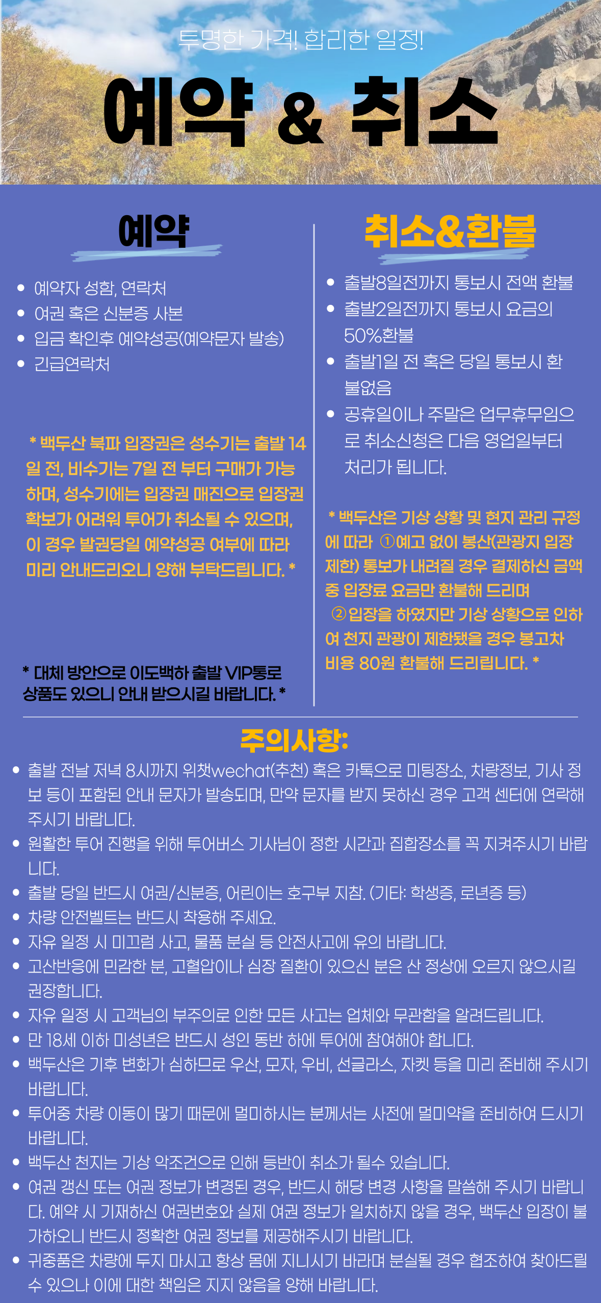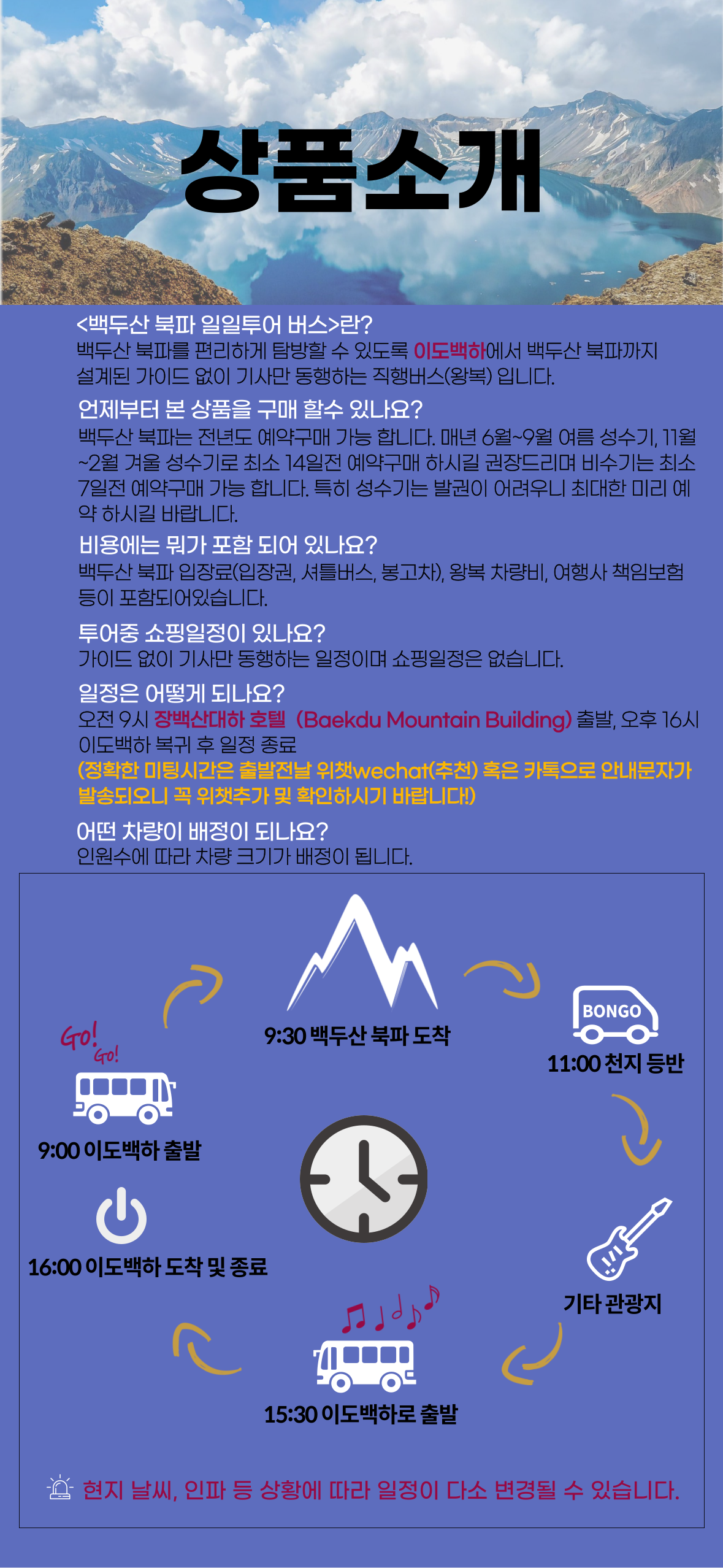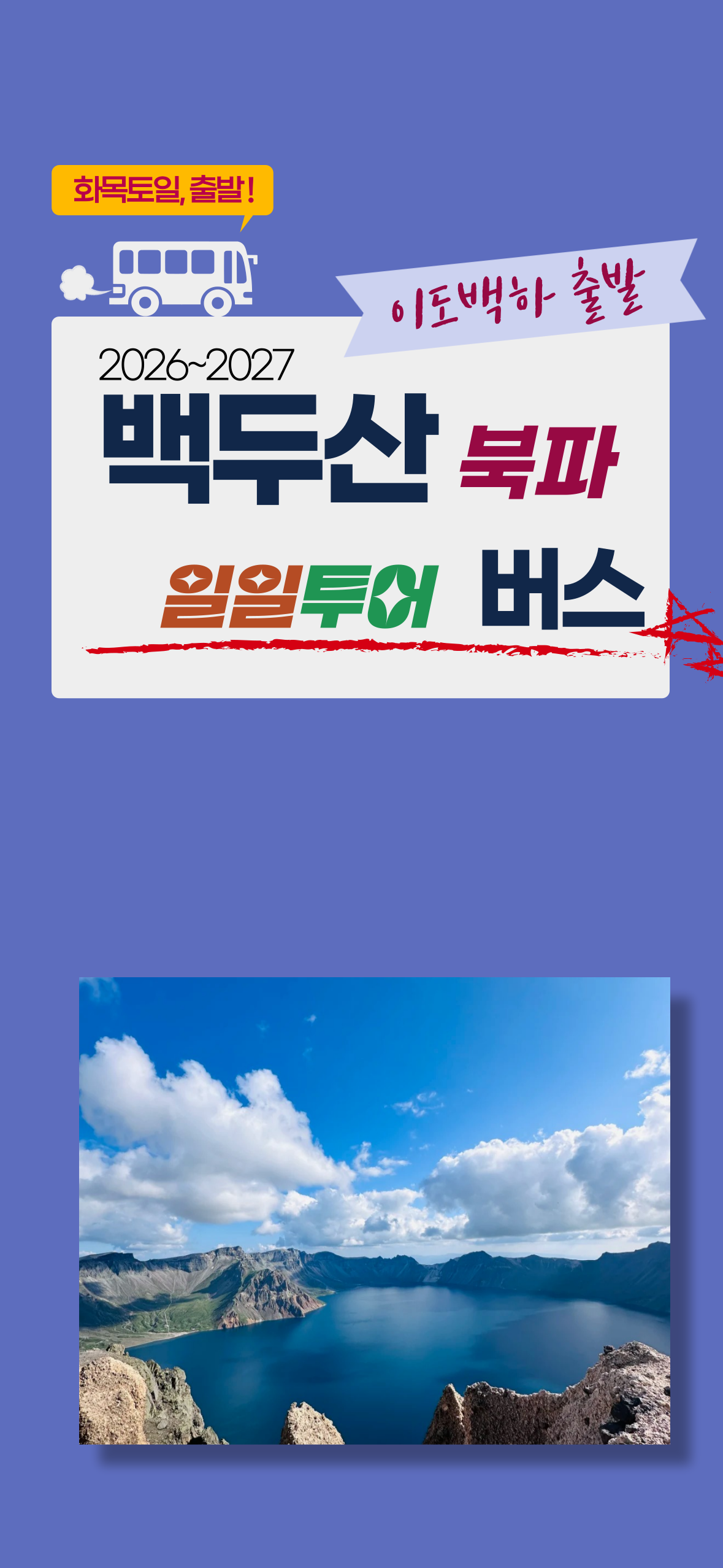 이도백하에서 출발해 하루 만에 백두산 천지를 다녀오는 알짜 일일 투어를 소개해요! 전용 차량으로 핵심 코스만 콕 집어 이동해 체력 부담도 적고, 동선도 효율적이라 편안하게 여행할 수 있어요. 하루 일정이라 다른 여행과 함께 즐기기에도 딱 좋아요. 백두산의 매력을 제대로 느끼고 싶다면, 이 투어로 떠나보세요!