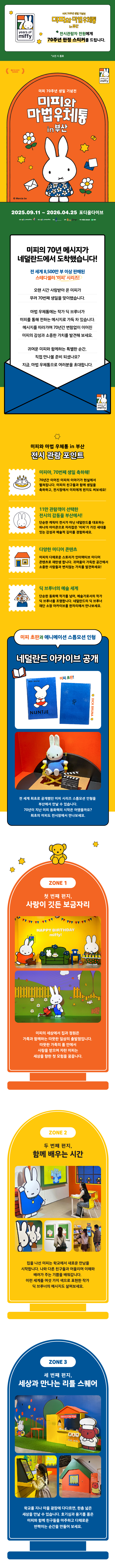 마법 우체통 속에는 작가 딕 브루너가 미피를 통해 전하고자 한 메시지들이 가득 담겨 있고, 그 메시지를 따라가다 보면 70년간 변함없이 이어져 온 미피의 감성과 소중한 가치를 발견할 수 있어요. 전시장에서는 미피의 친구들과 함께 생일을 축하하고, 미피에게 직접 편지를 써볼 수 있는 특별한 체험도 즐길 수 있답니다. 또 단순한 캐릭터를 넘어 🇳🇱 네덜란드를 대표하는 하나의 아이콘으로 자리 잡은 미피가 가진 세대를 잇는 감성과 예술적 깊이를 경험할 수 있어요. 미피의 다채로운 스토리는 인터랙티브 미디어 콘텐츠로 재탄생해 새로운 즐거움을 전하고, 네덜란드 딕 브루너 재단의 소중한 아카이브도 한자리에서 만나볼 수 있는 뜻깊은 기회가 돼요. 마지막으로 전시장에서만 만날 수 있는 귀여운 신상 굿즈들까지 준비되어 있어서, 이번 전시는 미피와 함께하는 가장 특별한 생일 파티가 될 거예요. 💌🎉
