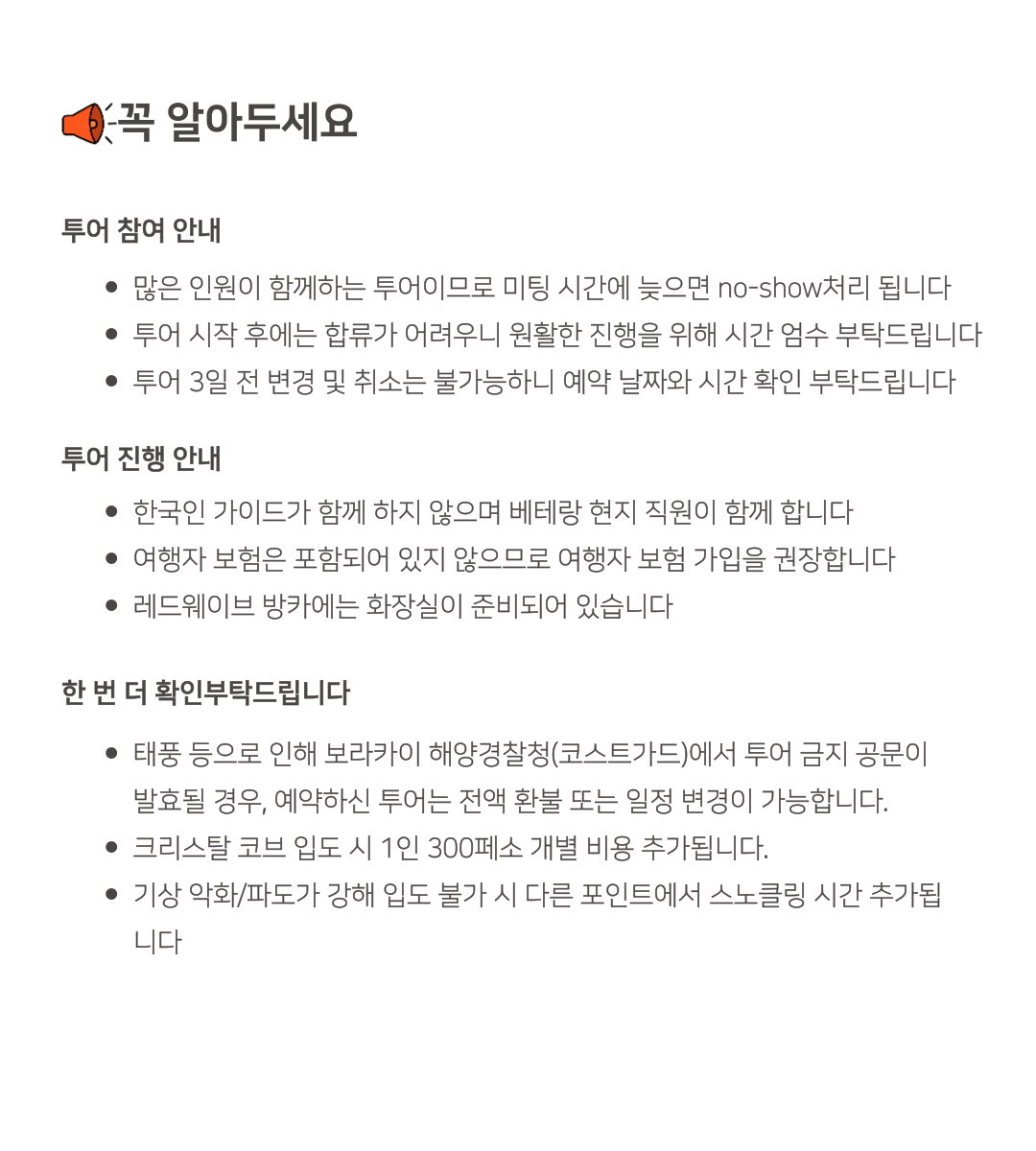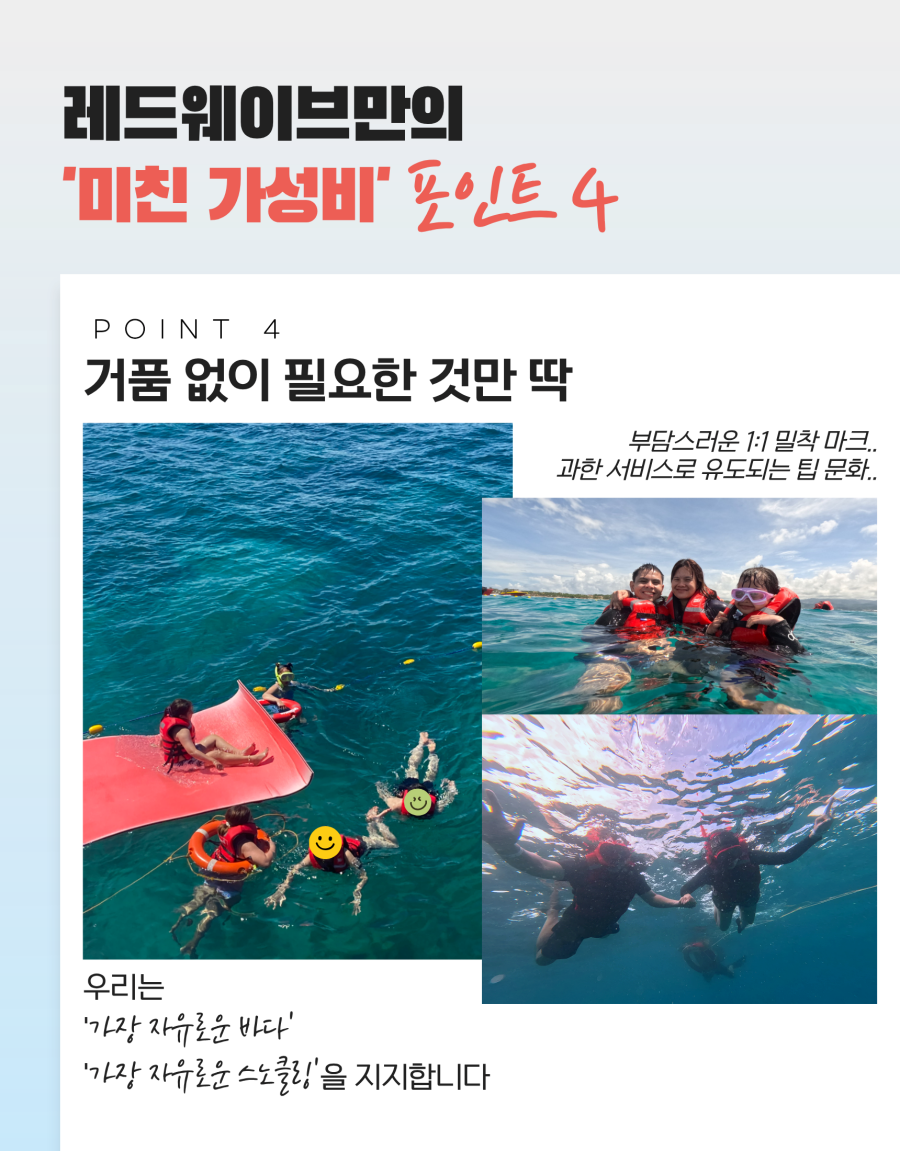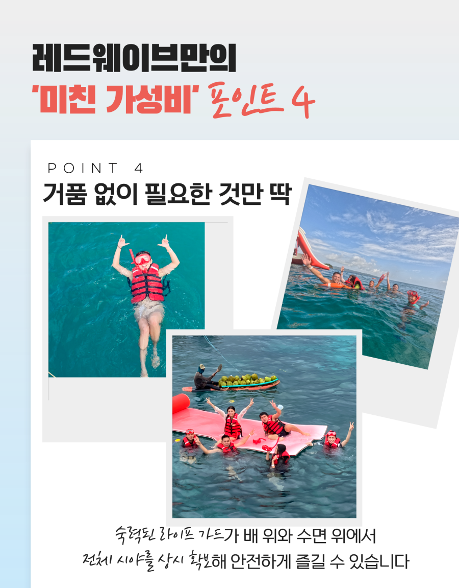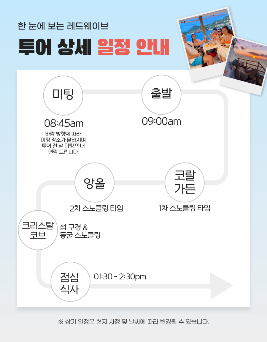 베스트직원들이 한국어 엄청 잘하시고 가격대비 너무 만족해서 후기 남겨요! 대형 요트에서 편안하게 이동하며, 복잡한 인파 없이 여유롭게 스노클링을 즐길 수 있었고 로컬 점심도 진짜 괜찮았어요! 저희는 너무 만족해서 팁도 듬뿍(?) 드렸어요!