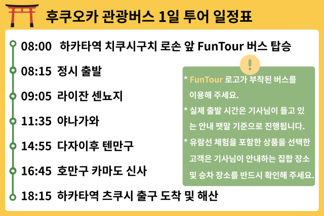 또한 편리한 승·하차 지점이 마련되어 있어, 일정이 끝난 후에도 자유롭게 후쿠오카 시내 관광을 이어갈 수 있어요. 하루 동안 알차게 떠나는 후쿠오카 근교 투어로 특별한 추억을 만들어 보세요!