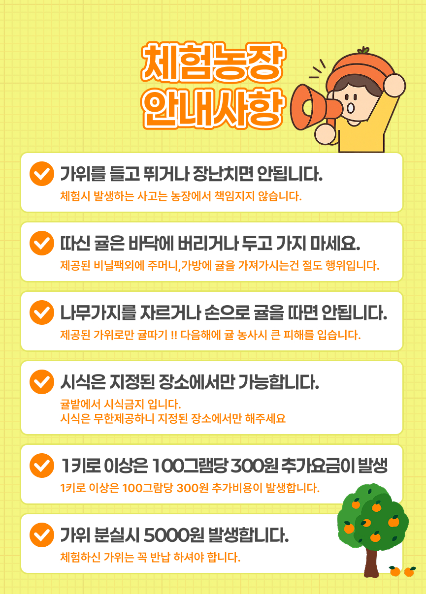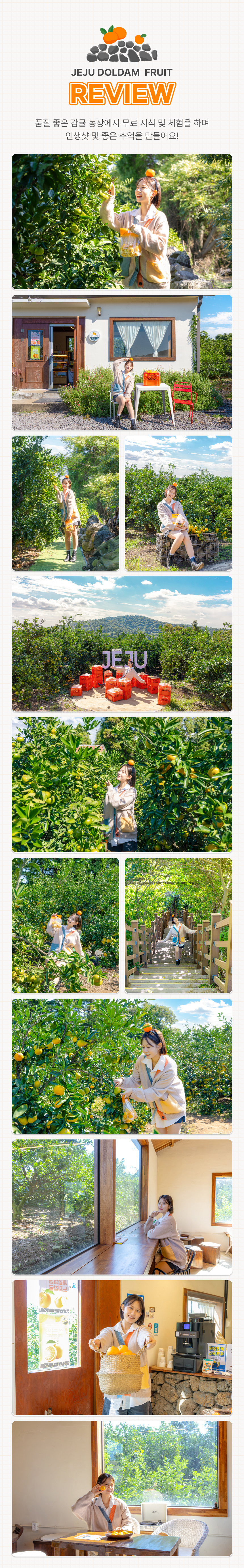 싱그러운 향이 가득한 품질 좋은 감귤 농장에서 직접 감귤을 따며 무료 시식 체험까지 즐길 수 있어요! 감귤 하나하나의 달콤함을 맛보며 1kg 포장해서 감귤을 집으로 가져갈 수 있답니다. 넓은 감귤밭 곳곳에는 감성 가득한 포토존이 마련되어 있어 인생샷을 남기기에 딱 좋아요. 또한 무료 커피 제공으로 향긋한 커피 한 잔과 함께 여유로운 제주 감귤의 오후를 즐길 수 있습니다.