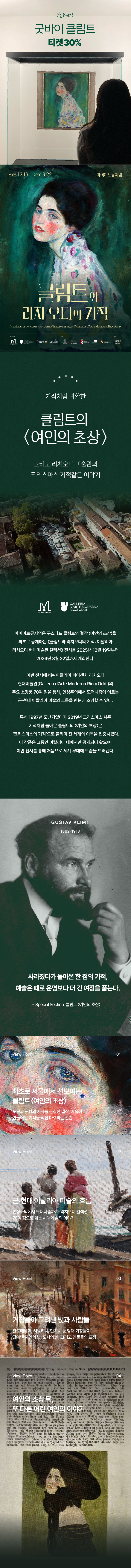 한국어 제공기적처럼 돌아온 명작을 만나는 단 한 번의 기회! 🎁 굿바이클림트 30% 할인! 신년 혜택, 놓치지 마세요 ✨ 판매기간: 2026.03.01.~2026.03.22. 관람기간: 2026.03.01.~2026.03.22. 취소기간: 2026.03.01.~2026.03.22. 19시(*이후 사용 및 환불 불가)