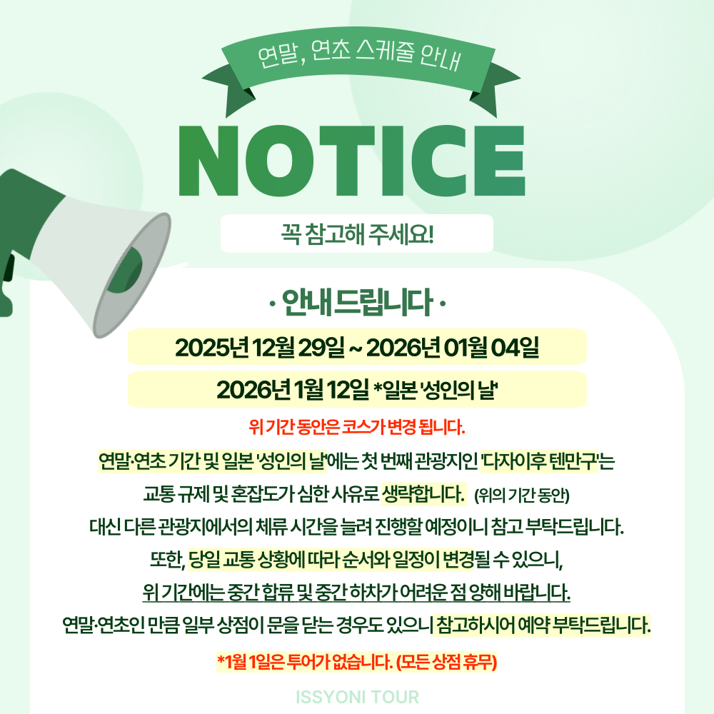 후쿠오카 하카타에서 아침 일찍 출발해, 하루 동안 히타·유후인·다자이후·유후다케 명소를 한 번에 둘러보는 효율적인 일정이에요. 도심에서 교외까지 이동이 편리한 전용 버스로 편안하게 여행할 수 있어요. 맑은 시냇물과 전통이 살아 있는 히타, 감성 가득한 거리와 온천이 유명한 유후인, 그리고 학문의 신을 모신 다자이후 텐만구, 웨딩 사진 명소로도 아름다운 대자연 유후다케까지 일본의 매력을 한 번에 느껴보세요. 하카타로 돌아오는 일정이 빠른 편이라, 투어 후 쇼핑이나 식사를 즐길 수 있는 여유 시간이 충분해요. 하루를 알차게 보내고도 저녁엔 도심에서 편히 쉴 수 있는게 장점이에요!