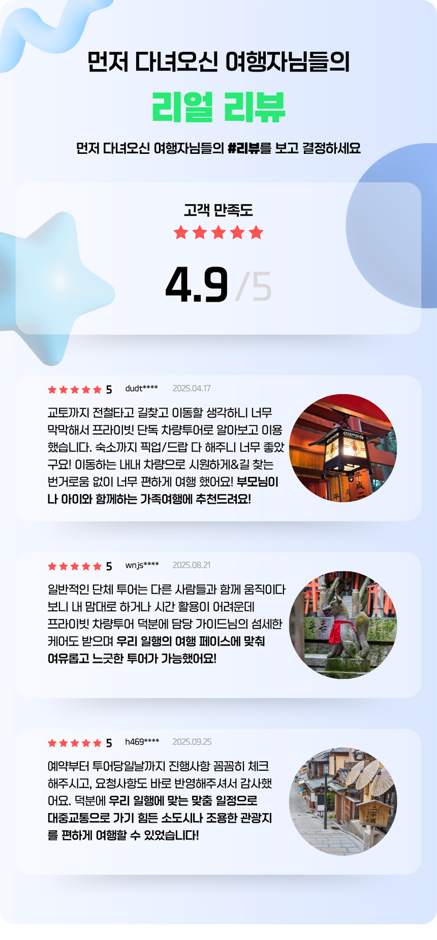 투어에 참여하기만 하면 전원 무료 사진 촬영과 일본 쇼핑의 성지 돈키호테와 빅카메라 할인쿠폰까지 증정되는 가자일본 투어와 함께 프라이빗한 교토 투어로 지금 떠나 보세요!