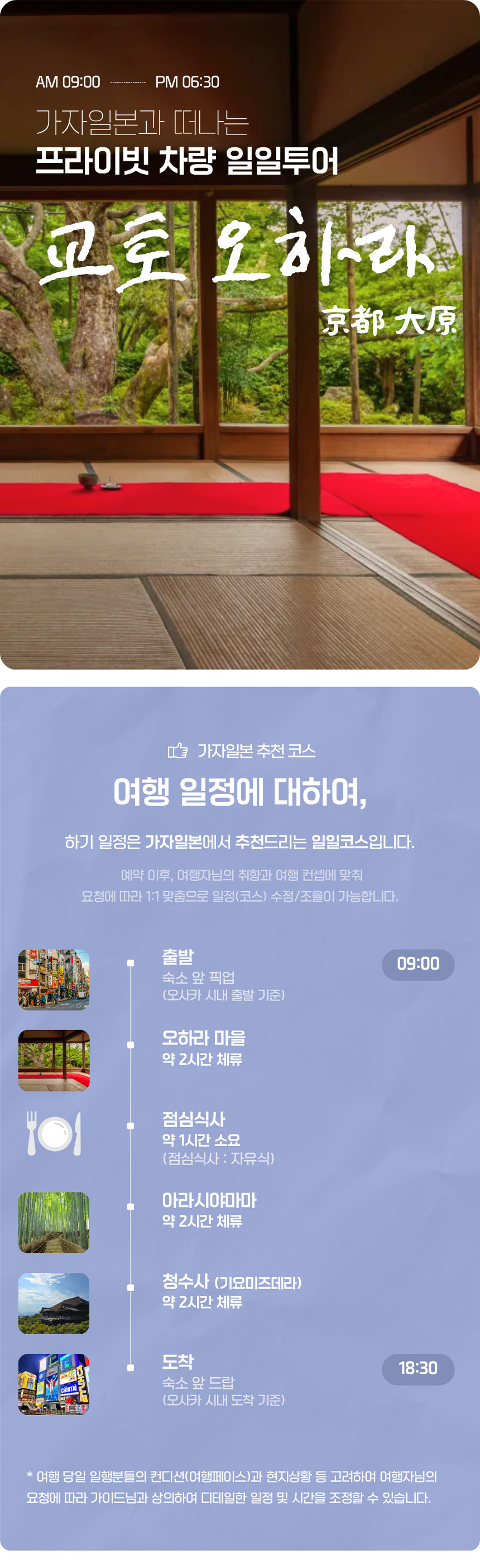 머물고 있는 호텔 픽업으로 편안하게 시작하는 교토 오하라 마을 일일 투어는 프라이빗하게 여행을 즐기고 싶은 분들에게 안성맞춤인 투어예요. 원하는 목적지가 있다면 취향에 맞게 자유롭게 변경할 수도 있고, 교토가 처음이라면 베테랑 가이드님의 추천 플랜에 맞추어 이동할 수도 있어요.