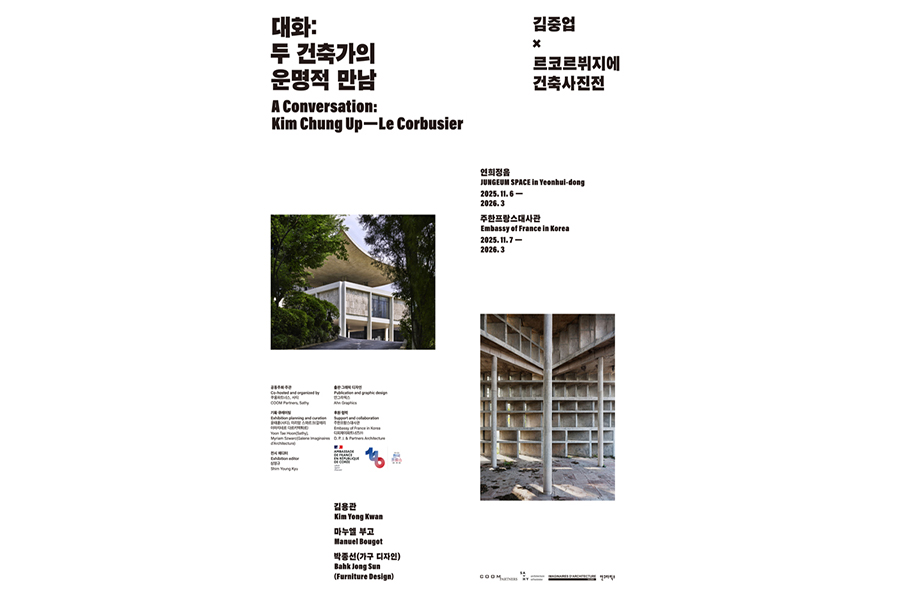 특히 이번 전시에서는 1968년 준공 이후 단 한 번도 공개되지 않았던 김중업의 진해 해군 공관이 최초로 공개됩니다. 그리고 김중업의 대표작인 주한 프랑스대사관과 그의 말년작 연희동 주택에서 전시가 동시에 열리며, 공간 자체가 작품이자 전시의 일부가 됩니다. 또한 한국 현대 건축사진을 대표하는 김용관 작가, 코르뷔지에의 찬디가르를 평생 기록한 마누엘 부고의 시선이 더해져 두 건축가의 세계가 명확한 이미지로 새롭게 정리됩니다.