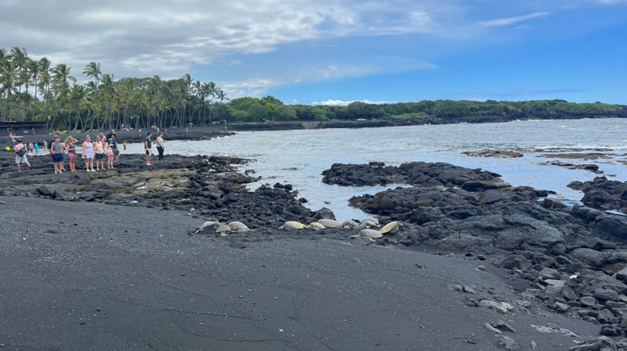 화산 활동으로 만들어진 검은 모래사장이 펼쳐져 있고, 바위에서 휴식을 취하는 바다거북을 만날 수 있는 신비로운 해변이에요.