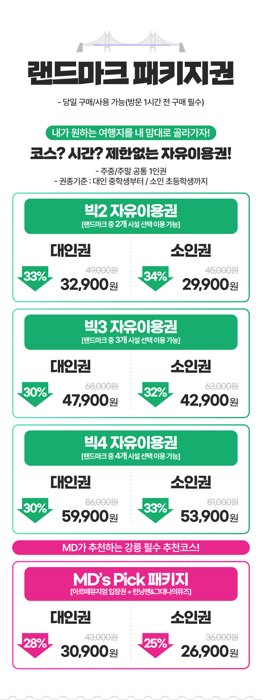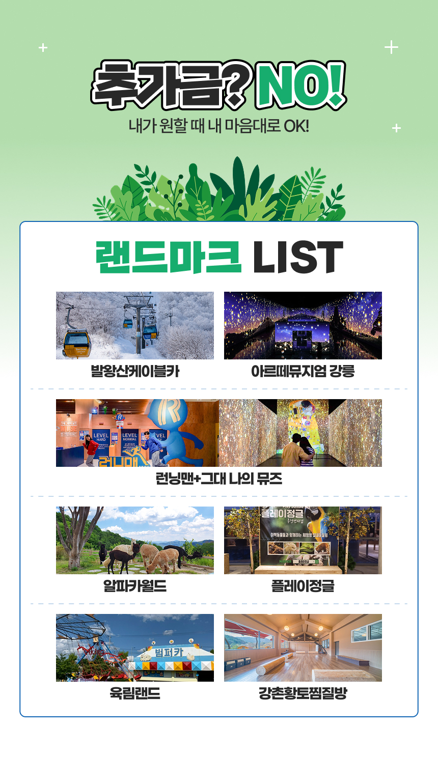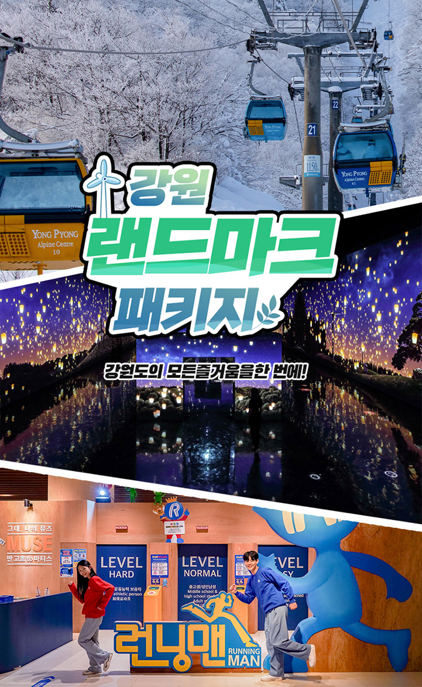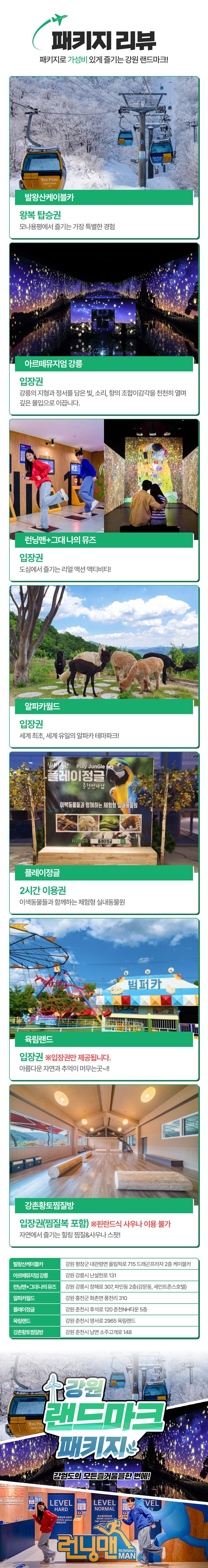 강원 랜드마크 패키지는 강원도의 인기 명소 중에서 내가 원하는 시설을 자유롭게 선택하는 구조로 2개, 3개, 4개, MD 추천 패키지까지 다양하게 준비되어 있어요. 아르떼뮤지엄 강릉, 런닝맨+그댄 나의 뮤즈, 알파카월드, 플레이정글, 육림랜드, 강촌 황토찜질방 중에서 취향대로 조합해 나만의 여행 코스를 만들 수 있으며, 각각 개별 구매하는 것보다 훨씬 더 합리적인 가격으로 이용할 수 있어요.