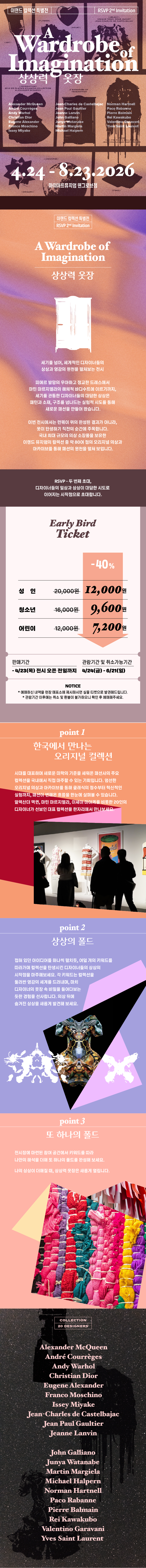 한국어 제공🧡 지금 얼리버드 기간 동안 더 특별한 혜택으로 만나보세요! 🧡 패션이 탄생하기 직전의 상상을 누구보다 먼저, 가장 가까이에서 경험할 수 있는 시간입니다. 놓치면 아쉬울 기회예요. ✨ 판매기간 : 2026.03.06 ~ 2026.04.23 관람기간 : 2026.04.24 ~ 2026.06.21