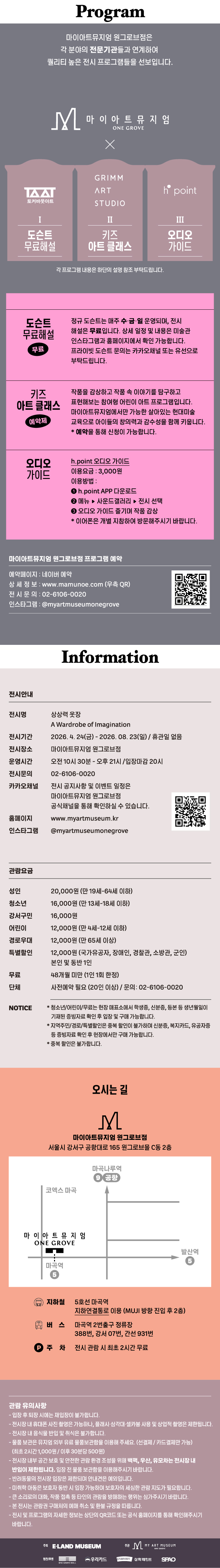 또한 국내 최대 규모의 의상 소장품을 보유한 이랜드뮤지엄의 컬렉션 약 80여 점과 오리지널 의상, 아카이브 자료가 함께 전시되어 패션의 흐름과 창작의 순간을 더욱 깊이 있게 이해할 수 있어요. 단순한 전시 관람을 넘어 패션이 탄생하는 상상의 세계를 경험해보세요.