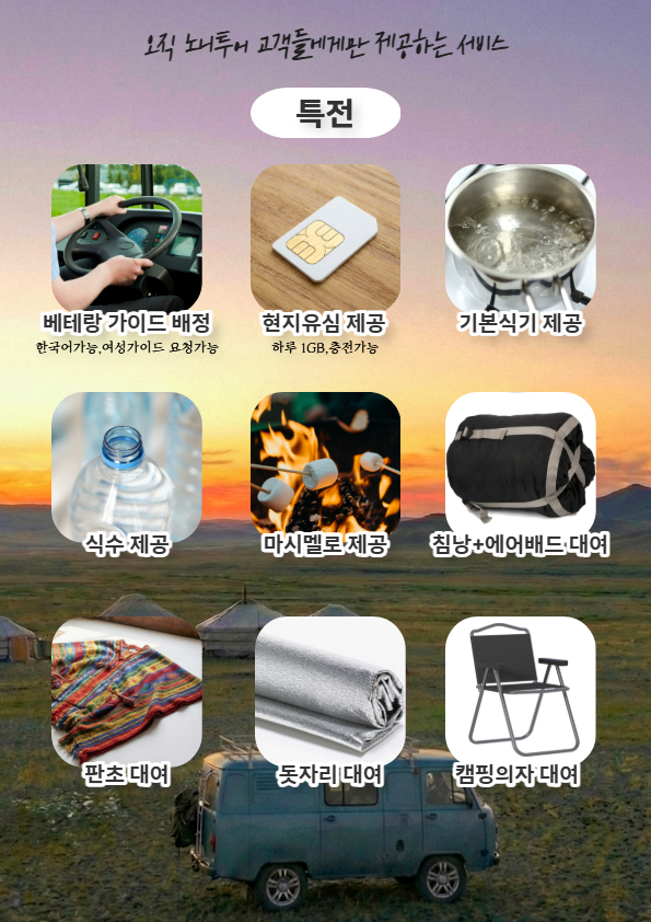 • 현지 유심칩(팀당/일 1GB), 마쉬멜로우,기본식기 및 냄비,침낭,판초,캠핑의자,돗자리,썰매,생수 (요청 시 제공&대여 합니다)