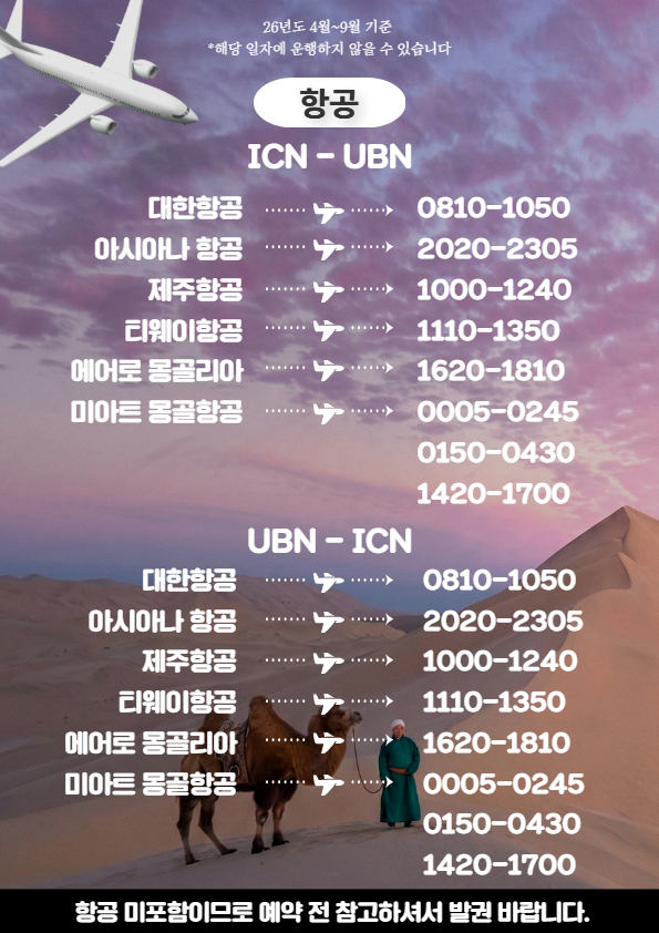 * 현지 도착시간이 늦은 오후일 경우 시내 숙박 또는 미니고비 일정부터 진행되며, 금액 변동은 발생하지 않습니다.