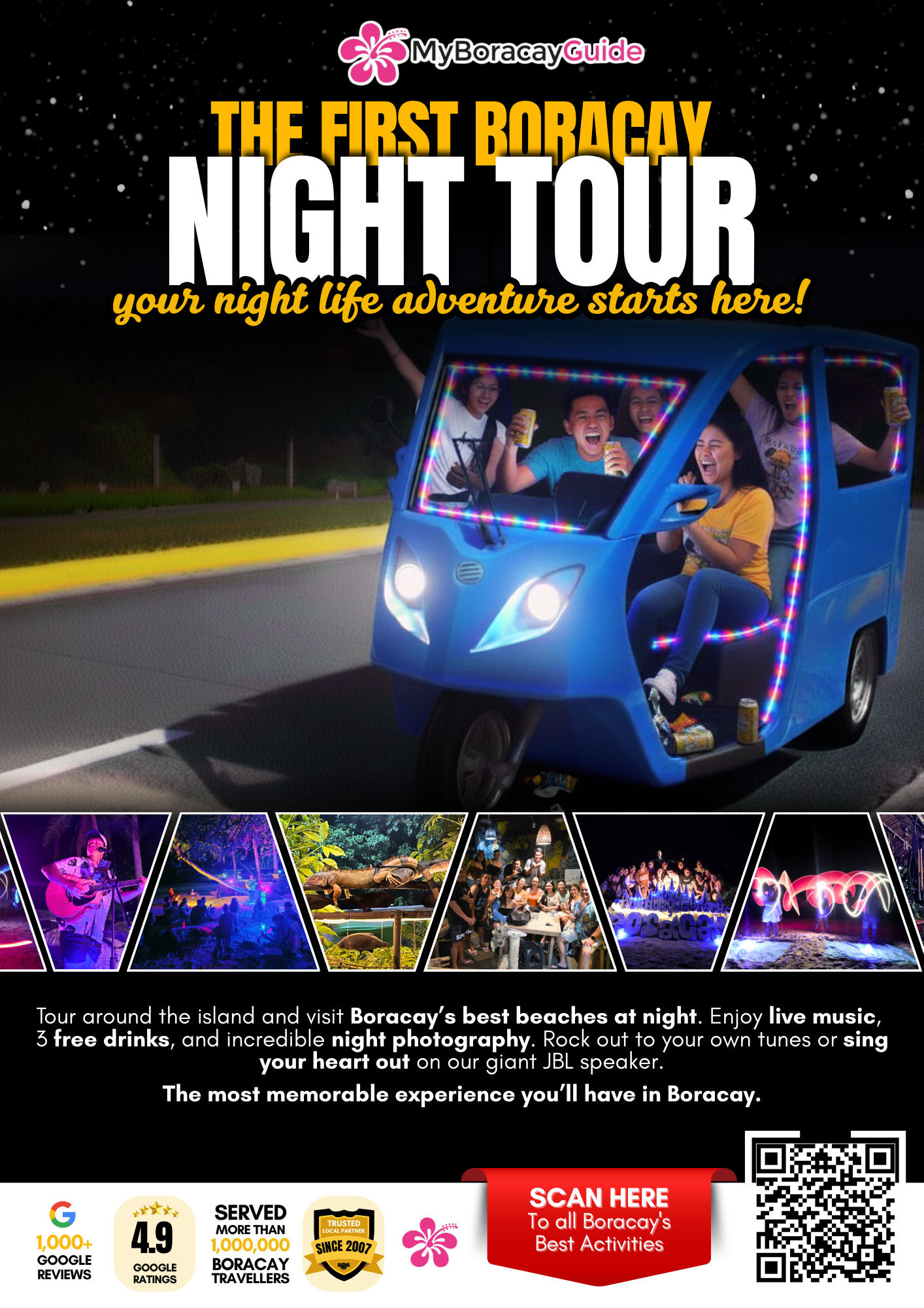 투어 마지막 해변에서는 별빛을 바라보며 휴식을 취하고, 가벼운 게임과 소셜 타임을 즐길 수 있어요. 음악과 음료는 계속 제공돼서, 자유로운 분위기 속에서 밤의 보라카이를 느낄 수 있답니다. 낭만적인 밤 산책과 함께 친구들과의 추억을 만들어 보세요.