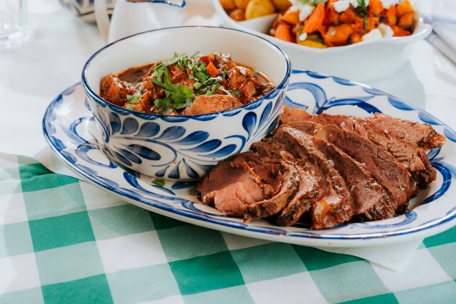 메인 요리는 테이블 단위로 나누어 즐기는 쉐어링 플래터로 제공돼요. 향신료와 와인으로 깊게 졸인 양고기 스티파도와 부드럽게 익힌 소고기가 메인으로 나오고, 마늘 향이 살아 있는 로스트 베이비 포테이토와 그리스식 채소 요리 브리암, 레드 와인 소스가 함께 곁들여져요. 채식 및 비건 고객에게는 감자와 가지로 만든 무사카가 제공돼 든든하고 풍부한 맛을 느낄 수 있어요.