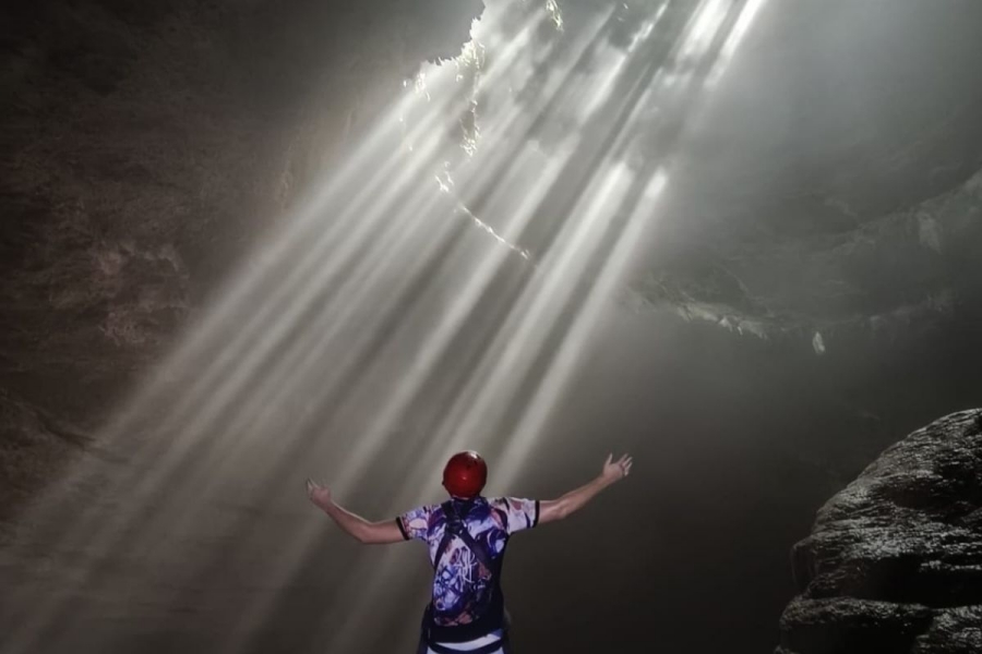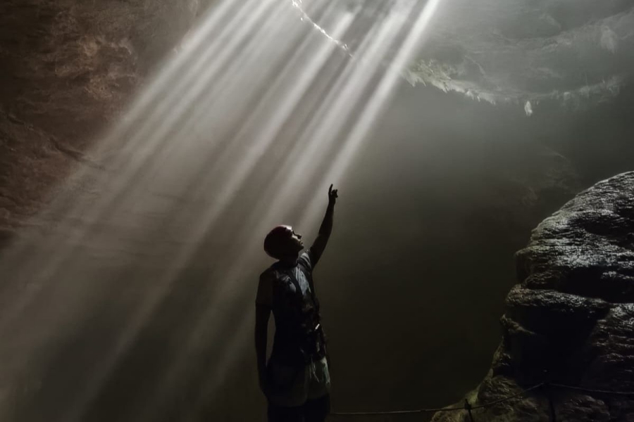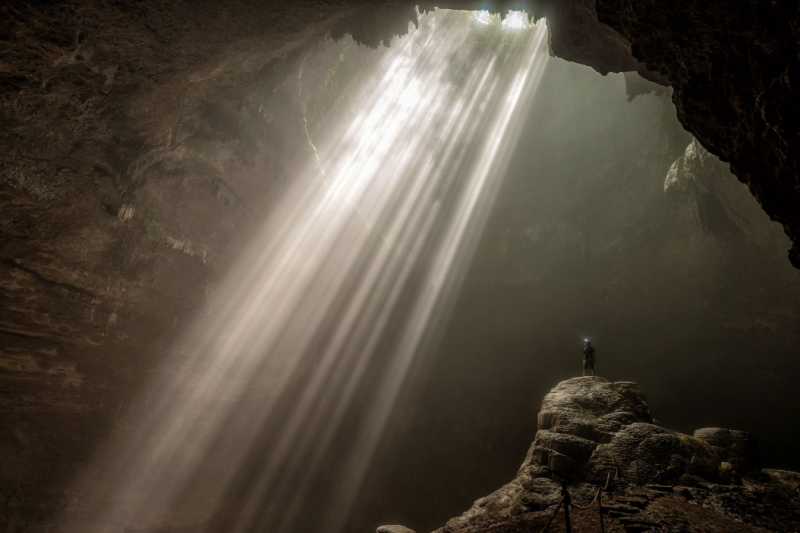 동굴 내부로 수직으로 내려가는 빛줄기 풍경이 자연의 경이로움을 볼 수 있어요.
