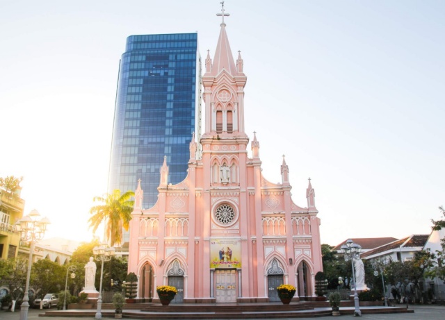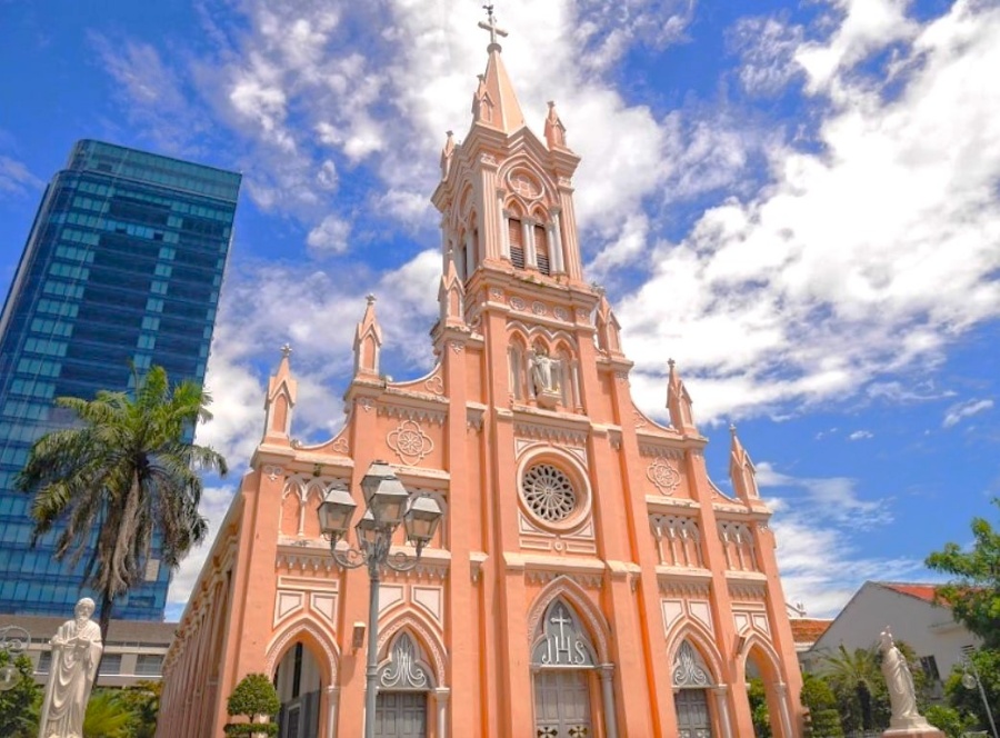 다낭 시내 한복판, 파란 하늘과 대비되는 화사한 분홍빛 외관은 보는 것만으로도 여행의 설렘을 깨웁니다. 프랑스 고딕 양식의 섬세한 디테일이 살아있는 이곳에서 우리만의 첫 번째 인생샷을 남겨보세요.