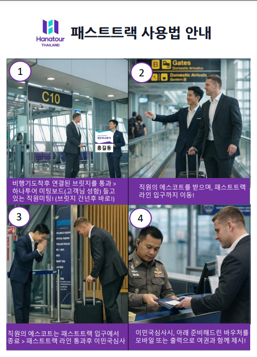 에스코트 해드리는 전담 직원은 패스트트랙 입구까지만 안내를 도와드리고 헤어지게되며, 패스트트랙 라인 통과 후 입국심사는 준비해드리는 서류와 함께 고객남께서 직접 이민국 직원과 진행하게 됩니다.