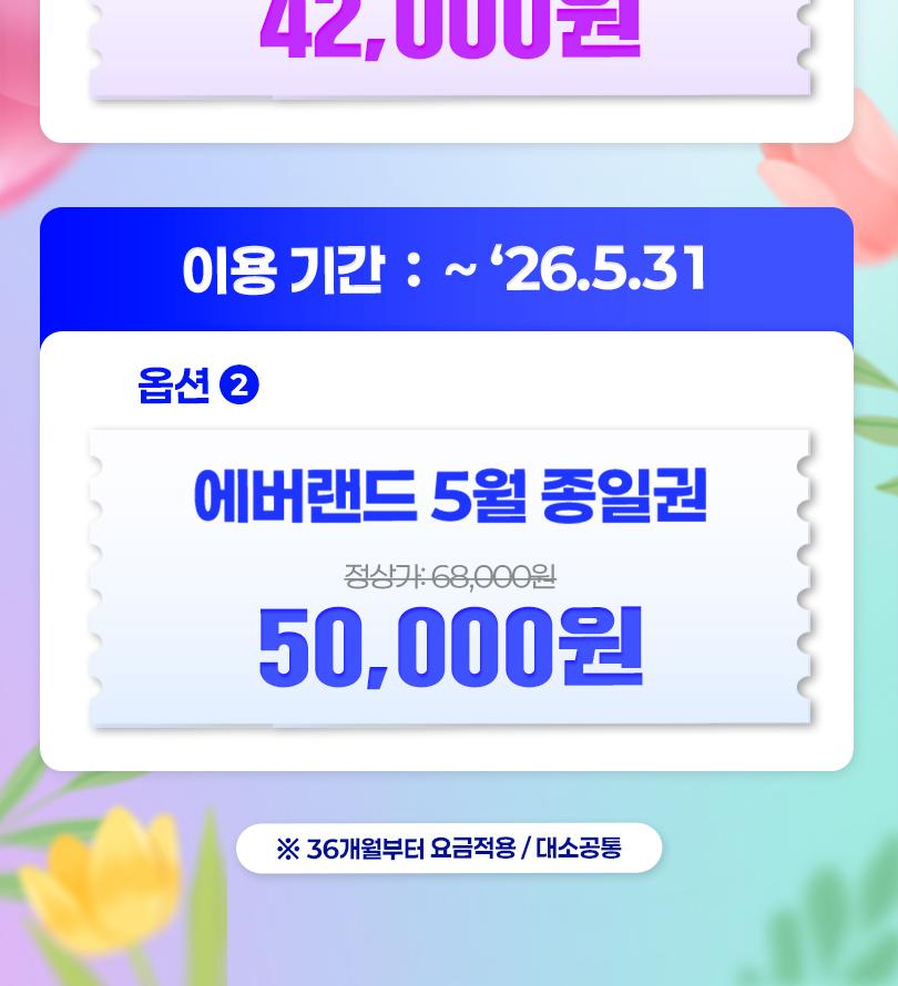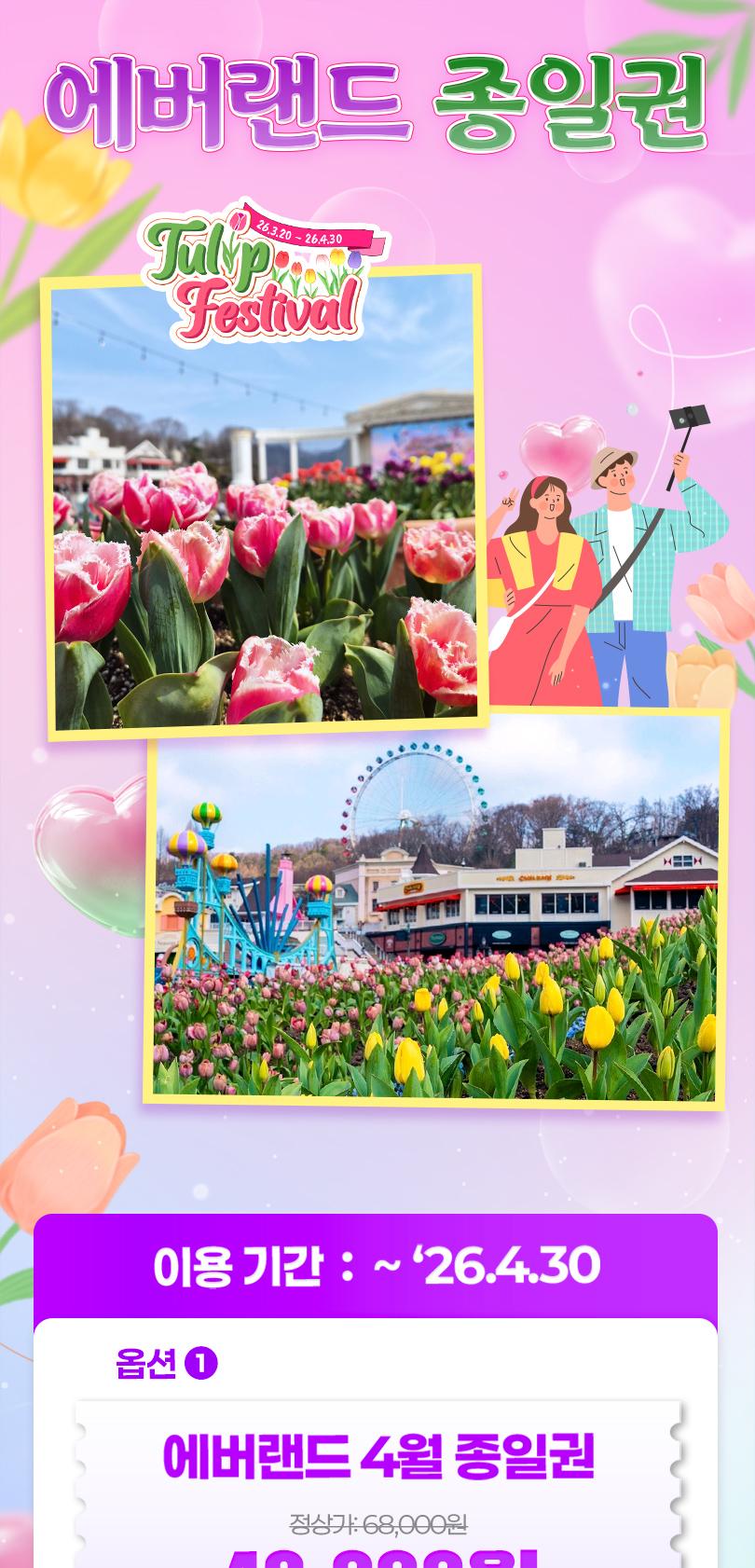 한국어 제공🎡 낮에는 짜릿한 어트랙션, 밤에는 반짝이는 야경! 지금 에버랜드 특가로 즐거움을 만끽하세요! 🌟🎠 판매기간 : ~ 2026.04.08 유효기간 : 옵션별 상이 - 4월 종일권 : 4월 30일까지 사용 가능 - 5월 종일권 : 5월 31일까지 사용 가능
